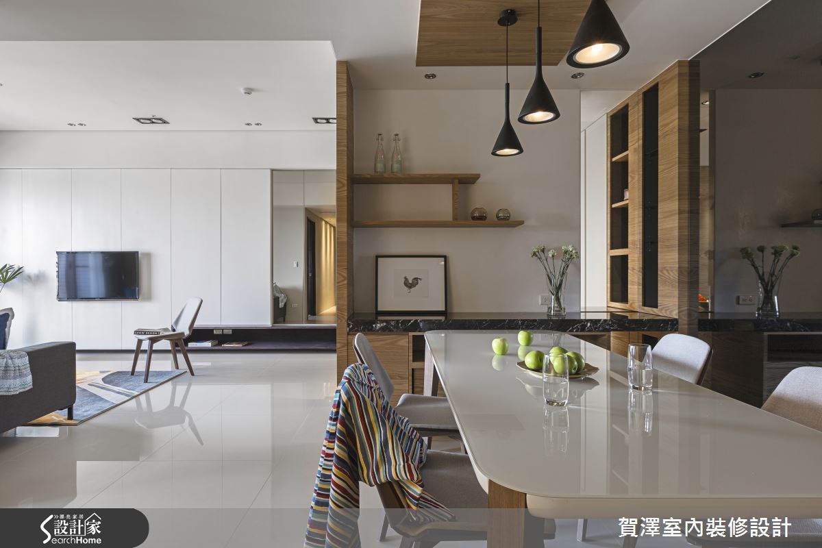 位於竹北市的 40 坪宅邸,是一對姊妹花共同購買的房子,空間擁有良好採光與美好視野,於是設計師延攬住宅優勢,以現代風定調風格,並將機能隱於無形且大量採用鏡面延展視野,打造出明亮簡練的居住環境,快跟著小編一起走進來看看吧! 走進居家,可見電視牆形成簡潔延續的立面,並於底部做出內凹設計,成了開放式置物區,且在牆面添入鏡面材質衍生空間放大感,搭配室內充裕採光,構成明亮氛圍,並藉由彩色抱枕、地毯的點綴,或是隨興擺放的單椅,增添不受拘束的生活態度;餐廳則除了中高櫃外,僅在牆面設置簡易層板,其餘大量餐具鍋盤收納則集中於廚房內,並配置茶玻、鏡面隔間,做出廚房、用餐區之間的彈性界定,讓光線可流通於兩者之間,也間接反射出雙倍空間感;臥房內則以木地板強調紓壓氣息,並在床頭以淡紫色打底,搭配色彩飽和的藍色床單及窗簾,營造繽紛活潑的層次視感! 小編的最愛 設計師在臥房角落做出收納空間,不僅消弭柱體突兀感,也讓小物書籍有了容身之處,既整齊美觀也方便取用,一舉兩得!