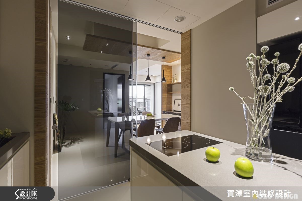 我們今天來到賀澤室內裝修設計工程有限公司位於新竹縣竹北的辦公室,此處空間原本是一家火鍋店,經過重新改造之後,搖身一變成為超有質感的室內設計辦公室,而且空間感也更加放大,讓人感覺不出來室內坪數竟然只有 28 坪,可以說是賀澤設計的扛鼎之作。 進入空間之前,黑色烤漆搭配清玻璃打造而成的大門,已透露了空間的現代美學質感,讓人留下最佳印象。而空間內部則根據使用需求,將格局大致區分為工作區、洽談區、沙發區、儲藏室及茶水間等。入口玄關處一道白色藝術端景牆讓視覺效果得到緩衝,並且具有指引動線的作用,上方的摺線型木質感天花板,巧妙展現了幾何造型美學,讓人一進門便感受到濃厚的藝術設計氣息。再往內走,玄關端景牆後方是沙發區,讓來訪的客戶可以在此暫時休憩,灰色電視牆與書牆形成完整空間感,營造出居家空間般的舒適氛圍。 空間另一側則設定為洽談區與工作區,兩者之間以多功能中島吧檯相互串聯,不但延伸了視覺效果,同時也讓空間的動線更加自由流暢。而當有客戶來訪需要獨立洽談空間時,則可利用窗簾區隔工作區與洽談區,在使用彈性上相當靈活。整體空間可以說是具體表現了設計師的高超功力,同時也展現了機能與美感的完美結合。 小編的最愛 這處有著大木桌的洽談區,不帶有一般商務空間的嚴肅氣息,感覺上就像是家裡的飯桌一樣。對於每個懷著緊張心情面對設計師的屋主而言,能夠在這樣的環境下來表達心中理想的居家空間,想必能夠放鬆心情暢所欲言,甚至獲得更多靈感吧!