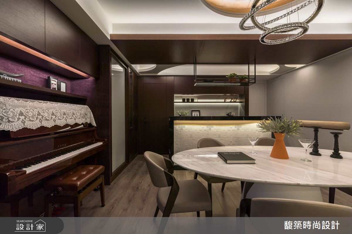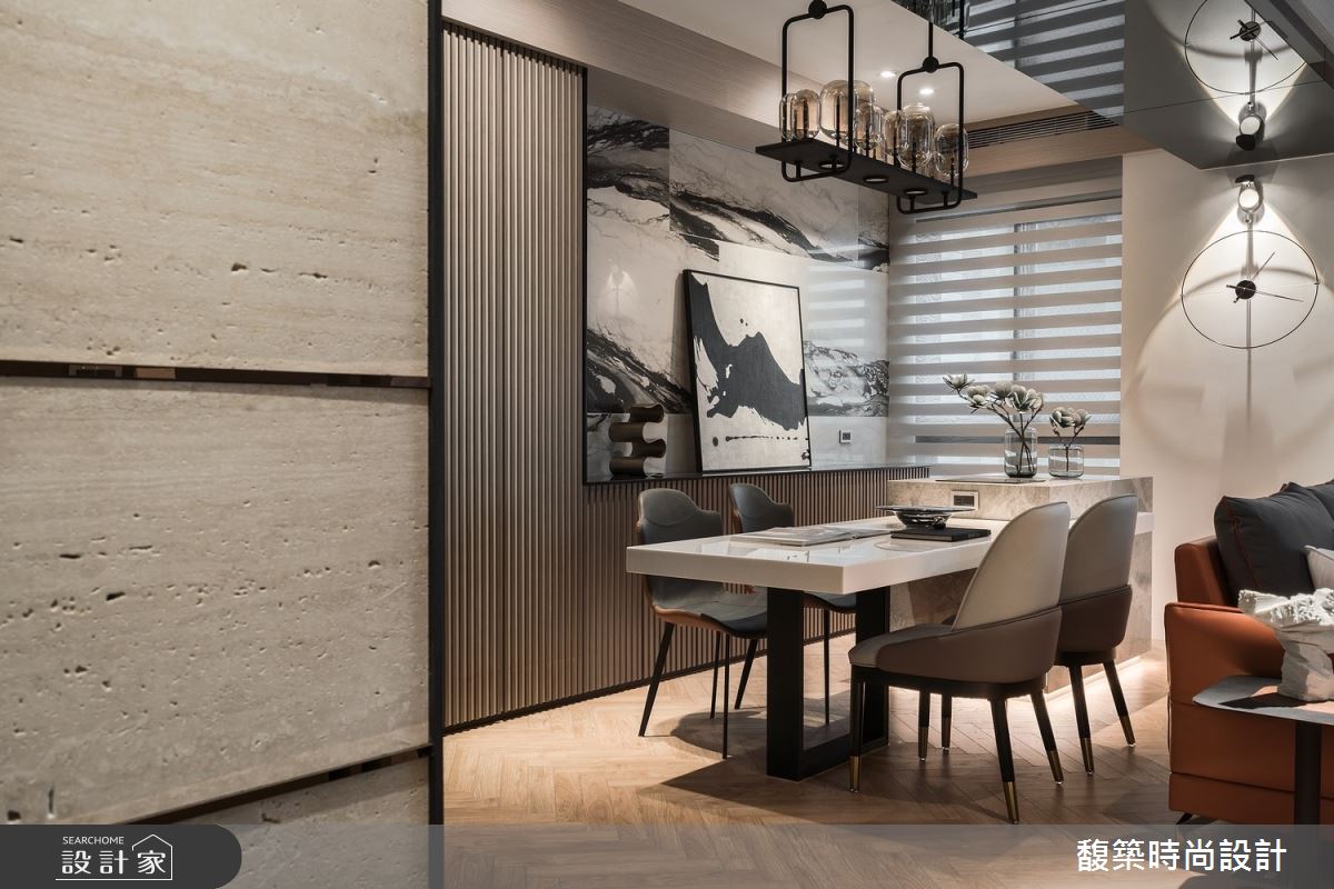 馥築時尚設計以灰鏡、金屬、石材、大理石、磁磚、木地板、壁紙的搭配應用,呈現混搭風居家氛圍,將此間32坪、兩房、單層、新成屋(5年以下)打造成舒適愜意的家庭空間,完成全家人的夢想之居。