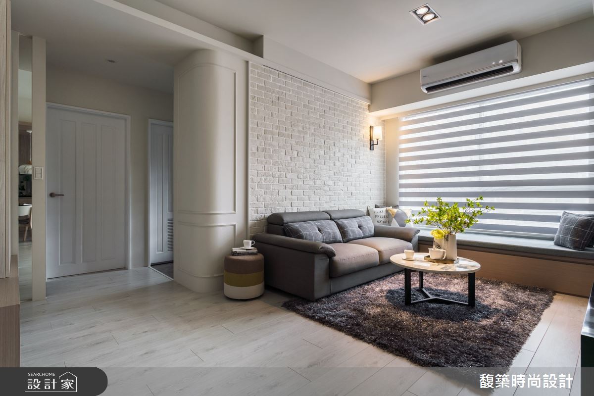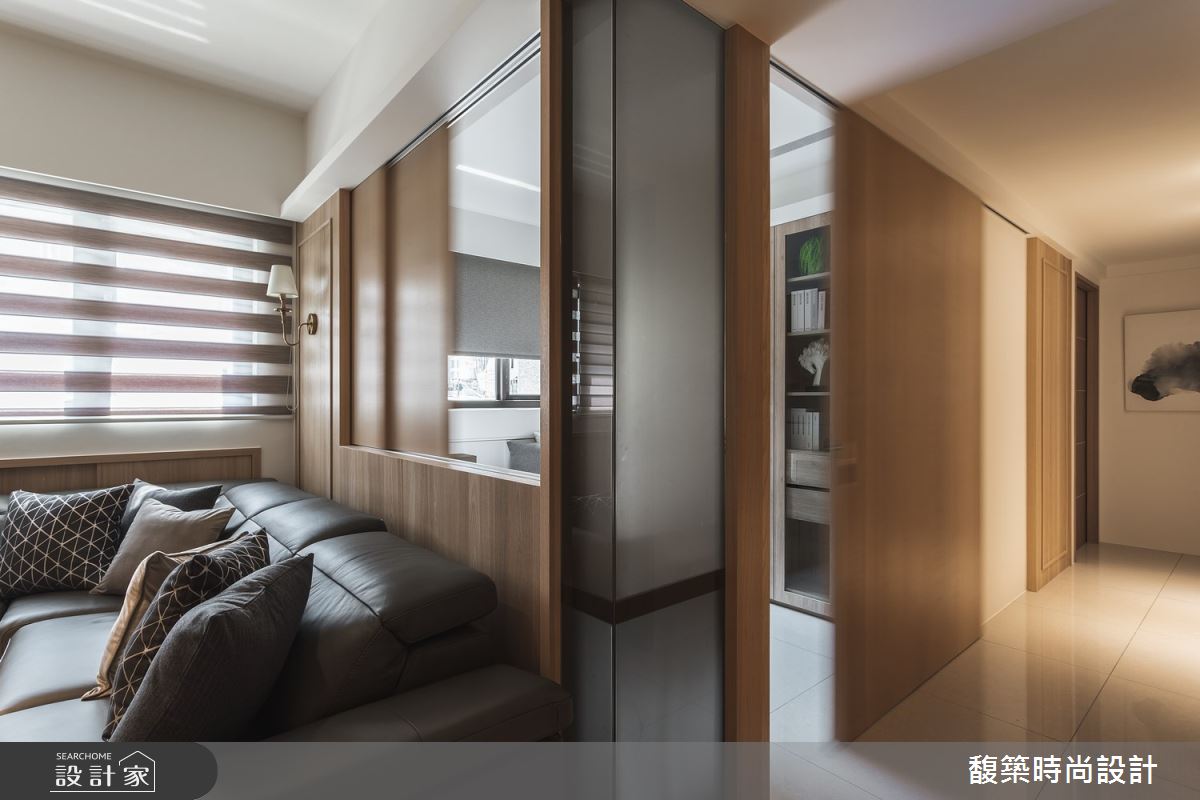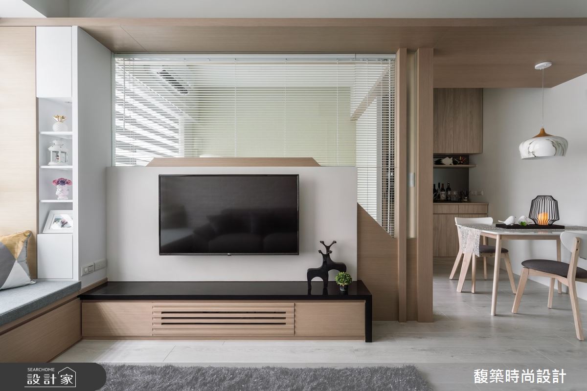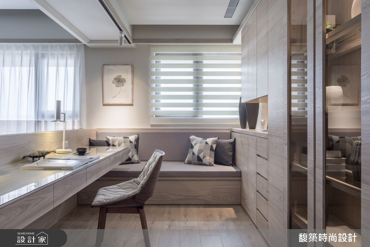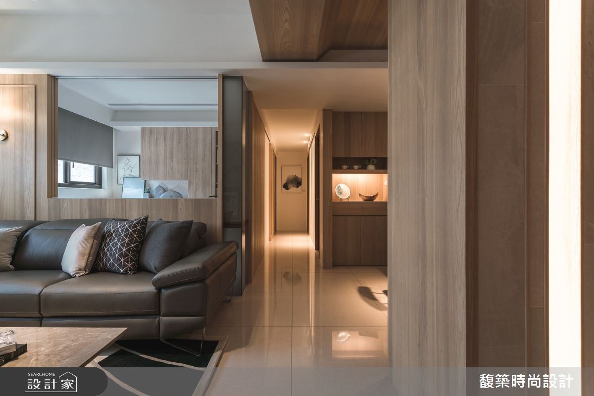 30坪現代風居家,設計師以開放格局串聯空間感,藉由灰、白、木色打底,並特別挑選浮雕木皮,鋪陳一室的溫潤,同時在入口處設置穿衣鏡、穿鞋椅,兼顧多元機能;並讓牆面材質一路延伸至電視主牆,以硅藻土鋪敘質樸感,襯佐木質不落地收納櫃,讓主牆顯得輕盈實用,且導引優良採光,創造敞朗環境,透過客廳與書房的開放串聯,形塑互動好生活,書房內書櫃則以黑玻取代實體門片,兼顧防塵與展示需求,並額外設置窗畔收納臥榻,賦予書房更多的可能;主臥,在床頭巧妙設計了木窗, 於一旁隱藏通往衛浴的入口,創造流暢的使用動線。