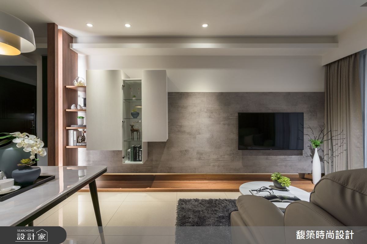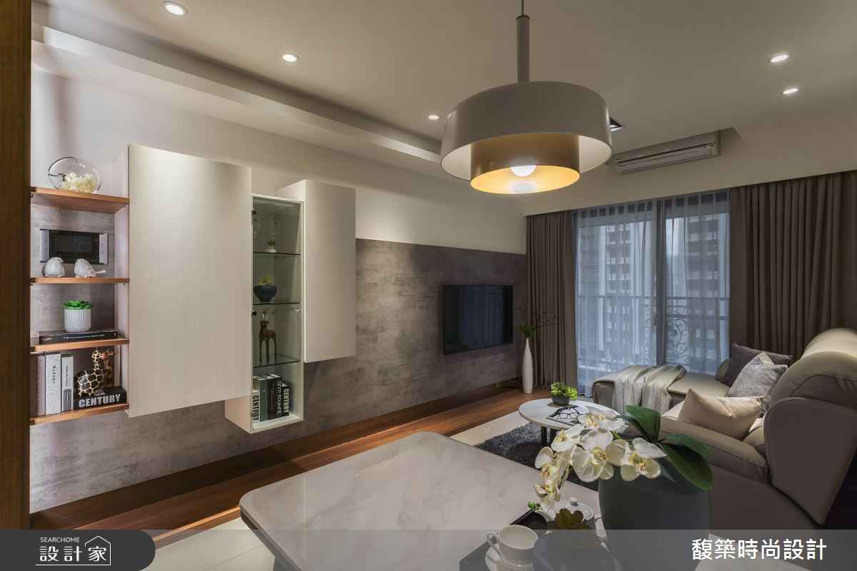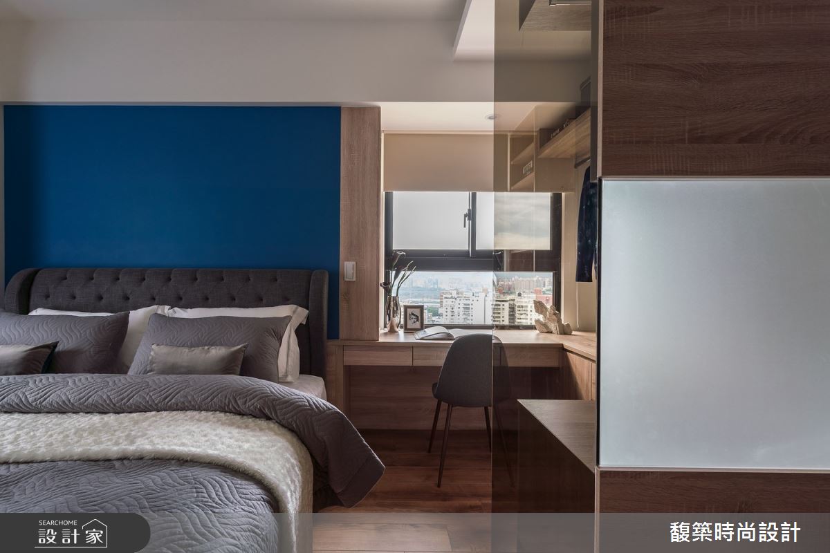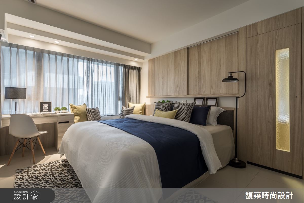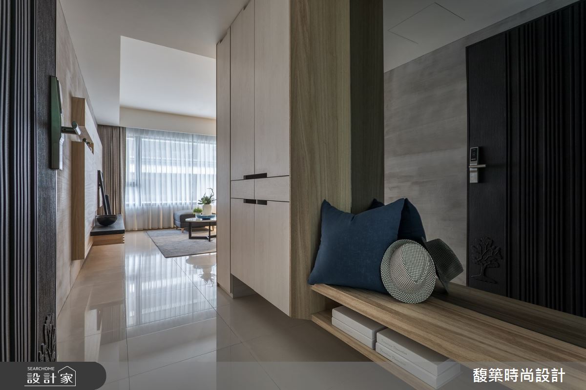30坪現代風居家,設計師以開放格局串聯空間感,藉由灰、白、木色打底,並特別挑選浮雕木皮,鋪陳一室的溫潤,同時在入口處設置穿衣鏡、穿鞋椅,兼顧多元機能;並讓牆面材質一路延伸至電視主牆,以硅藻土鋪敘質樸感,襯佐木質不落地收納櫃,讓主牆顯得輕盈實用,且導引優良採光,創造敞朗環境,透過客廳與書房的開放串聯,形塑互動好生活,書房內書櫃則以黑玻取代實體門片,兼顧防塵與展示需求,並額外設置窗畔收納臥榻,賦予書房更多的可能;主臥,在床頭巧妙設計了木窗, 於一旁隱藏通往衛浴的入口,創造流暢的使用動線。