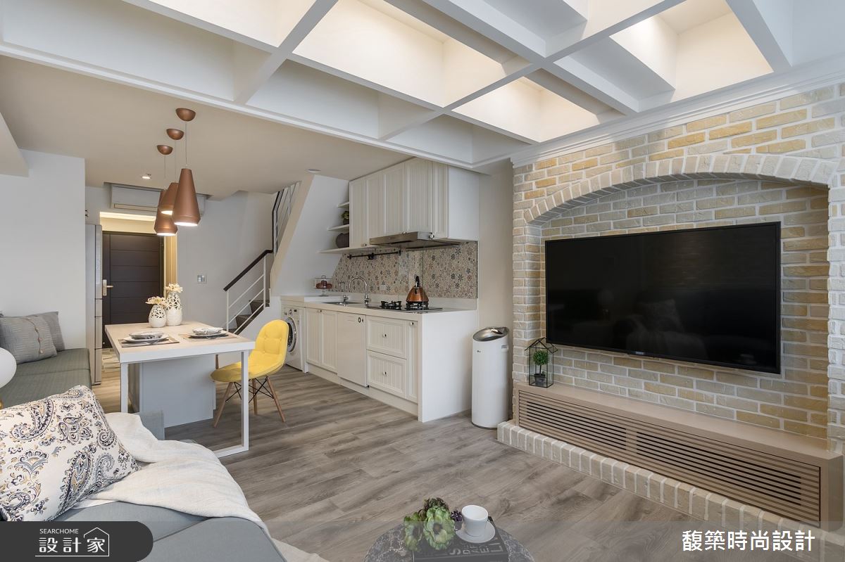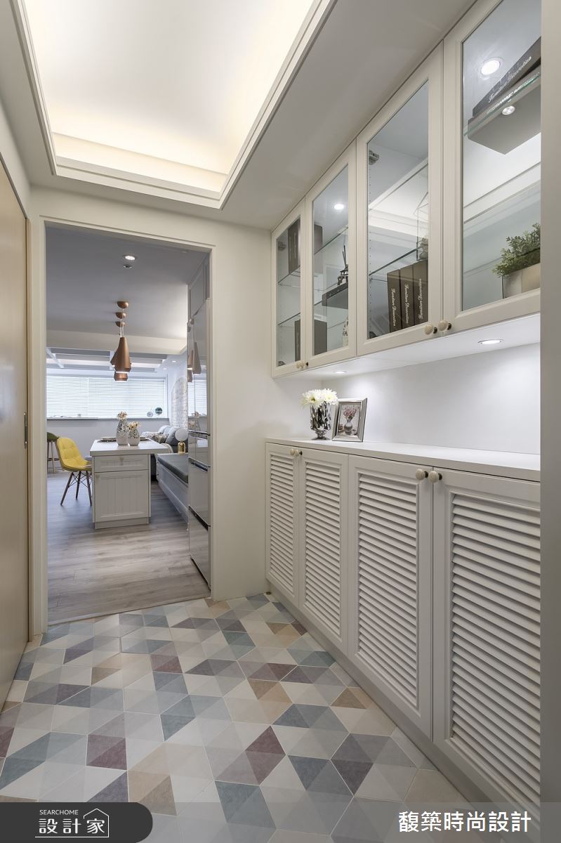 優雅的線板、潔白的牆面以及莫蘭迪色系的進口磁磚,是超過30年的老屋翻新後展現的新風貌。美式風格作為老屋新生的主軸,從玄關就能明顯感受到美式風格的溫柔典雅,拼色幾何地磚暗示著內部還有更多驚喜。由落塵區進入室內空間透地材轉換表現出來,餐廚家具則延續玄關櫃設計,經典的美式線板替空間帶來安穩親和的氛圍。流理檯的防濺板帶點花卉造型,呼應軟裝紋理;一字型公共區域,則做了文化石拱形牆面界定出客廳。空間裡的色系依循木質色調發展,運用相近色系的淺米、鵝黃、粉橘等等來豐富居家表情。