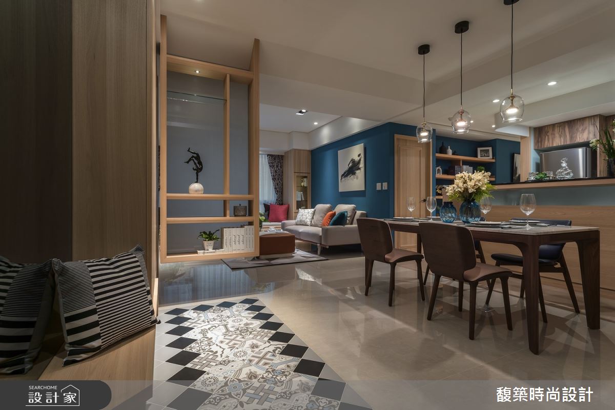 2 大 2 小 生活的 30 坪老屋,格局重塑後,帶來舒適好住且機能實用的生活感。整室透過木質帶出住宅該有的溫潤感,再利用格柵設計、出奇不意的大理石材料拼搭於牆面、櫃體,給予木質北歐風多一些層次感,而大膽卻完美融入空間的高飽和度土耳其藍,賦予老屋截然不同的個性風貌。 開放式的公共空間,玄關處透過地坪圖樣的轉換、便利的穿鞋椅,輕盈界定出獨立落塵區;兼具風水及展示收藏的霧面屏風,則帶給室內使用者隱私感。餐廳及廚房之間串接吧檯規劃,提供一家四口多元使用機能並帶來便利使用動線。坐擁大面積大理石電視牆的客廳區,則安排了窗邊臥榻,擴增坐位數並成為家庭成員回家放鬆的愜意小天堂。客廳沙發牆一路漫延至廊道的高飽和度藍色系牆面,不僅替生活裝點了活潑色彩,也帶來聚焦及延伸視覺效果。 小編的最愛 為滿足四個人的收納需求,多處運用隱藏式設計,如餐廳區的木格柵隱藏式收納、臥榻下方的收納櫃等,皆保留視覺的寬敞下,盡可能增添儲物空間。臥房除了注重收納規劃外,還選擇運用可收折床鋪,替小’空間找到更多的使用可能。