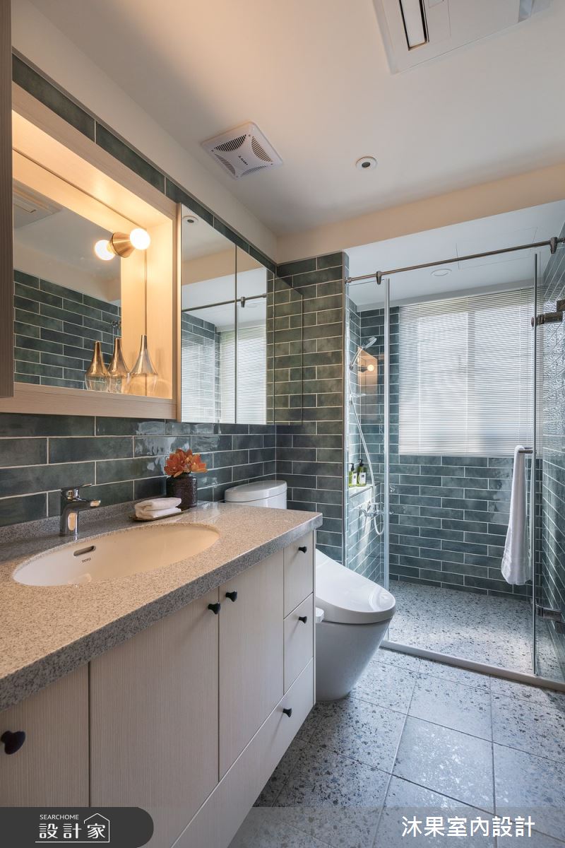 沐果室內設計以油漆、花磚、壁紙、超耐磨木地板、鐵件、茶玻、木作貼皮、烤漆、鋼刷木皮、系統板材、磁磚、木百葉、人造石、繃布、噴漆、窗簾、調光捲簾、鋁百葉簾的搭配應用,呈現混搭風居家氛圍,將此間31坪、三房、單層、中古屋(5~15年)打造成舒適愜意的家庭空間,完成2位大人、2位小孩全家人的夢想之居。