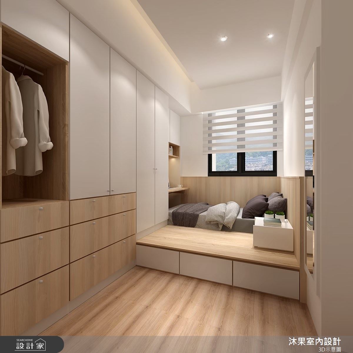 沐果室內設計以油漆、壁紙、超耐磨木地板、木作貼皮、鋼刷木皮、系統板材、茶鏡的搭配應用,呈現現代風居家氛圍,將此間24坪、三房、單層、新成屋(5年以下)打造成舒適愜意的家庭空間,完成2位大人、1位小孩全家人的夢想之居。