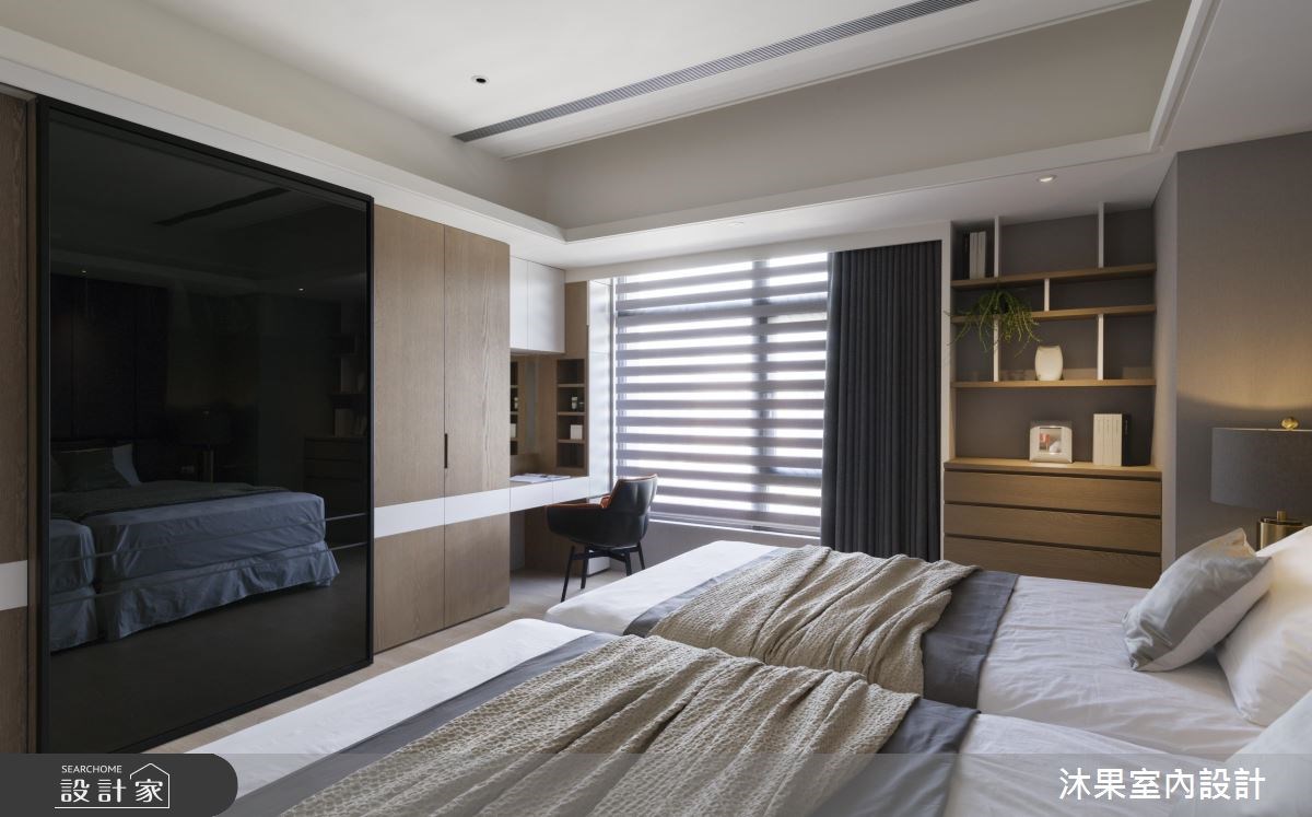 本案為沐果室內設計的55坪現代風新成屋(5年以下)設計作品,格局為單層四房的居住空間。居住成員包含2位大人、2位小孩、2位長輩。全室建材的搭配,應用壁紙、超耐磨木地板、鐵件、噴漆、玻璃、木皮、窗簾、系統櫃,展現溫馨的居家氛圍。
