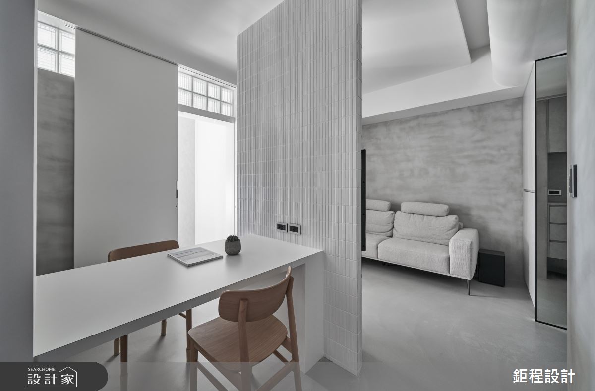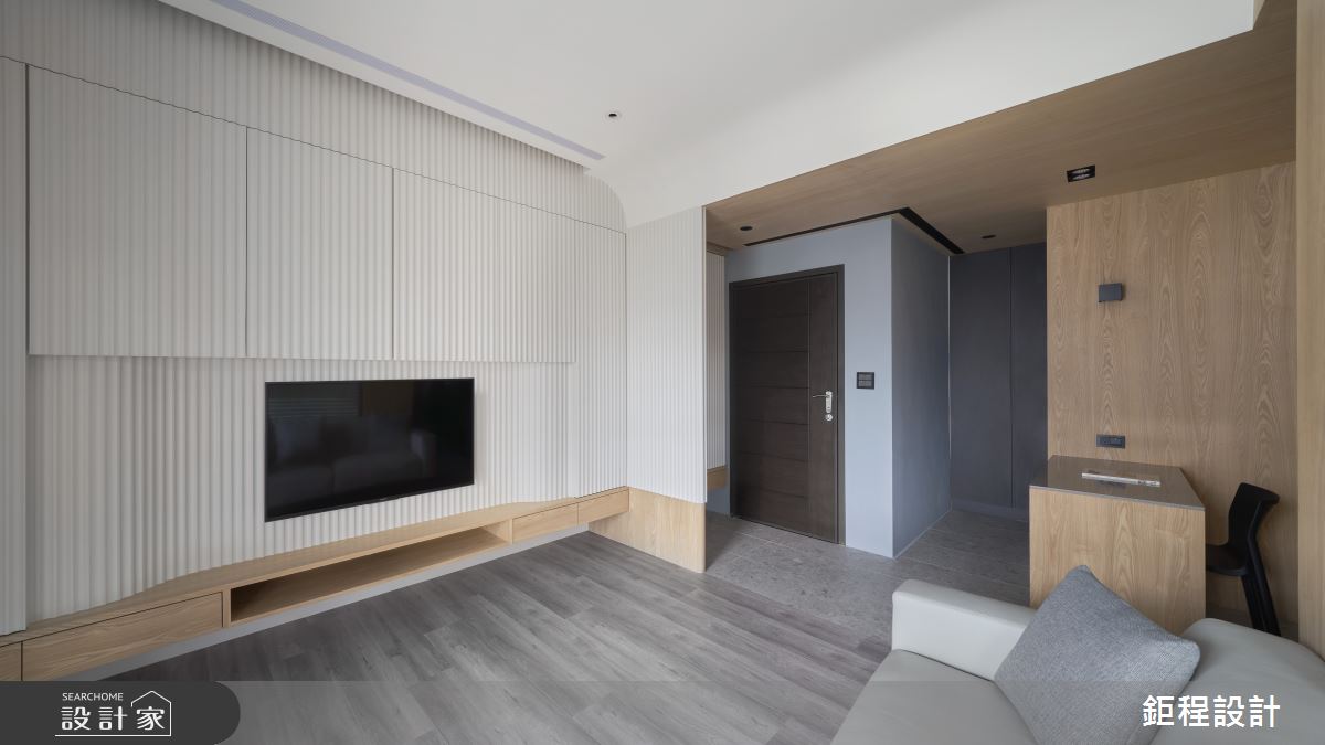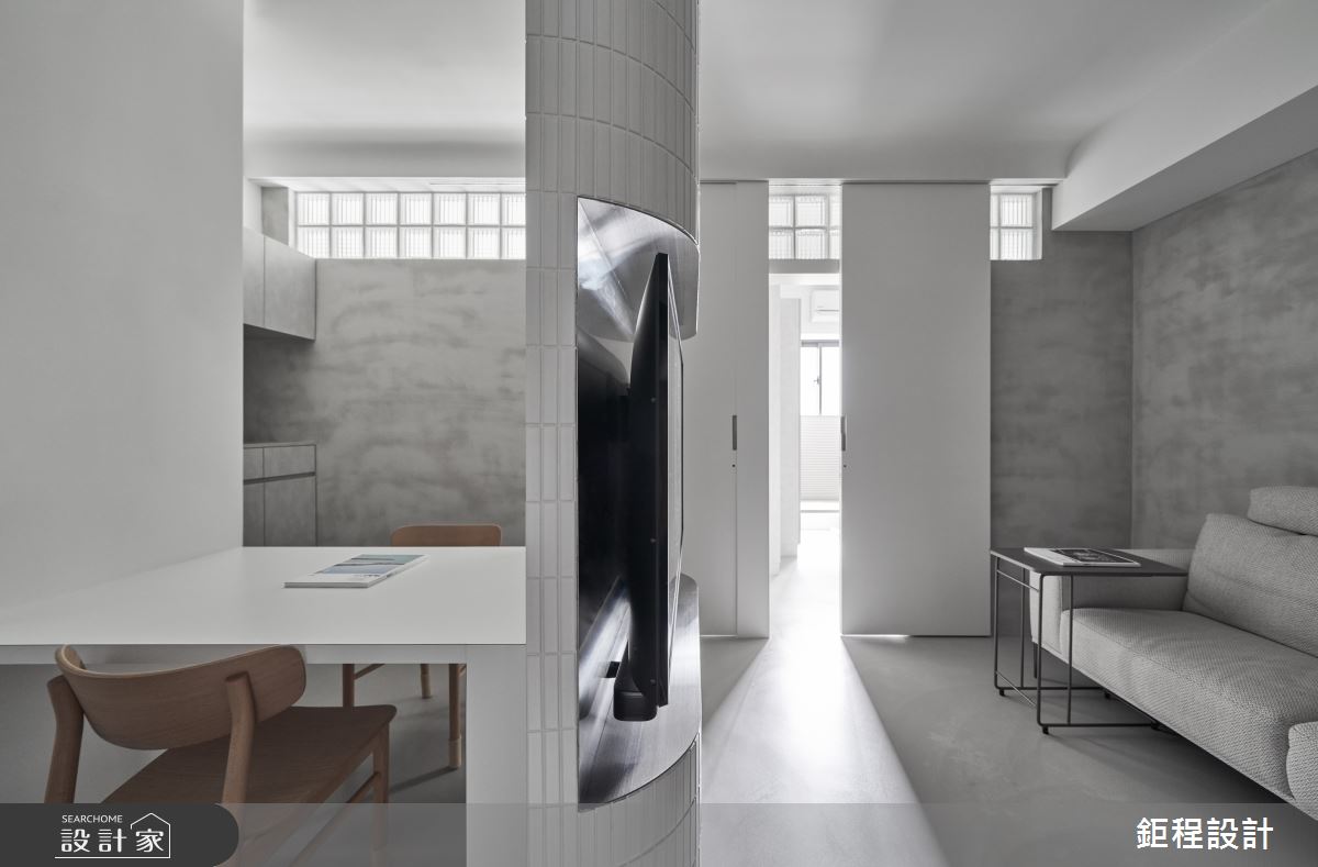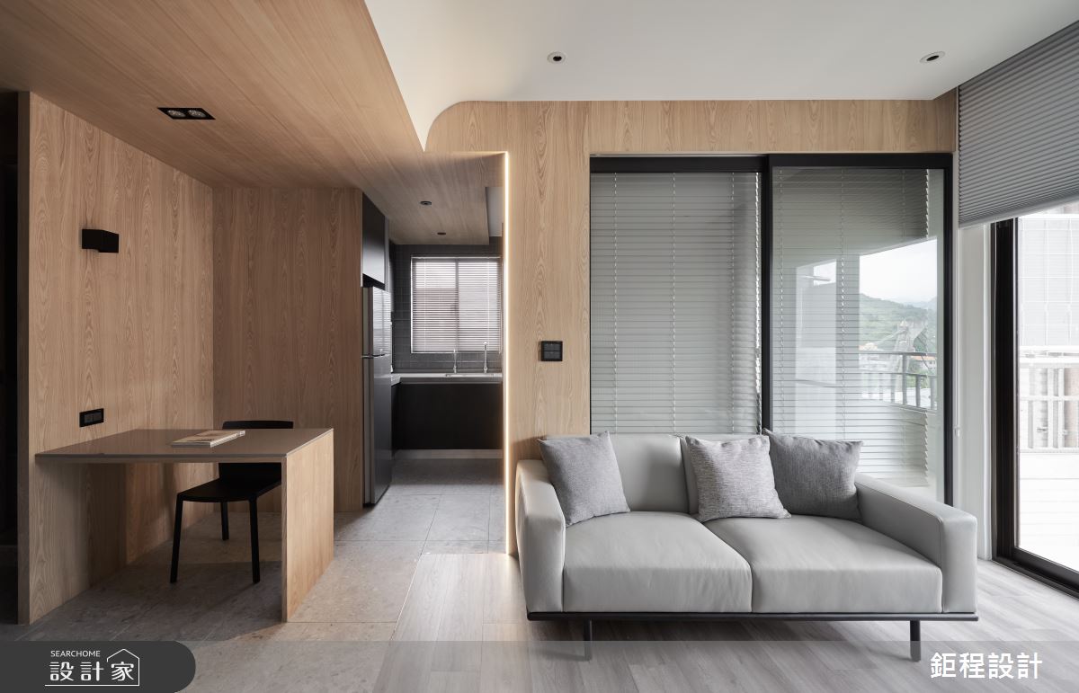 鉅程設計以不鏽鋼、磁磚、水泥/水泥粉光、噴漆、玻璃磚、優的鋼石的搭配應用,呈現現代風居家氛圍,將此間14坪、兩房、單層、新成屋(5年以下)打造成舒適愜意的家庭空間,完成1位大人全家人的夢想之居。