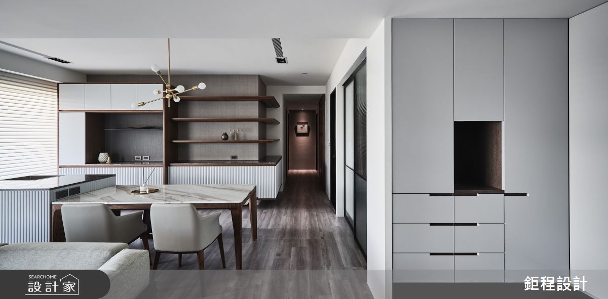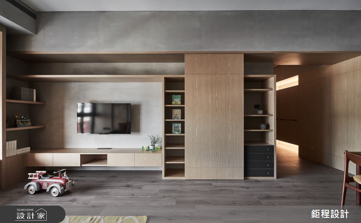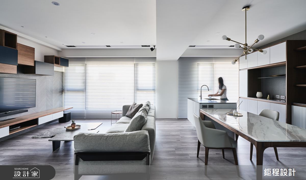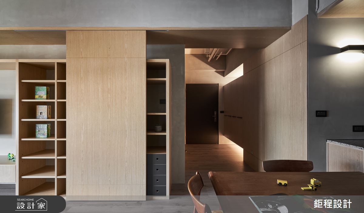 來自鉅程設計的55坪現代風住宅案,屋主一家人共有2位大人、1位小孩,是一間單層新成屋(5年以下)的兩房格局,設計師藉由建材以油漆、超耐磨木地板、鐵件、木作貼皮、噴漆、美耐板、霧玻璃的搭配應用,實現一家人的理想生活。