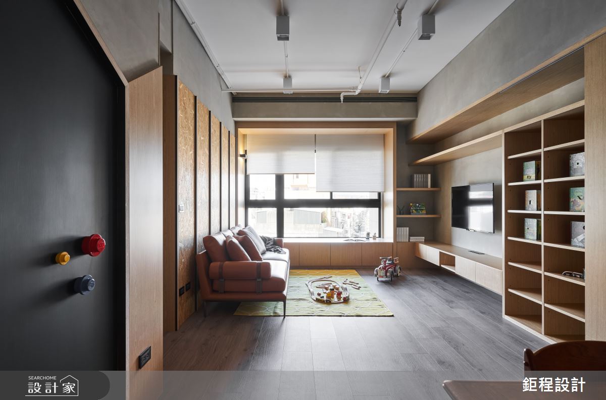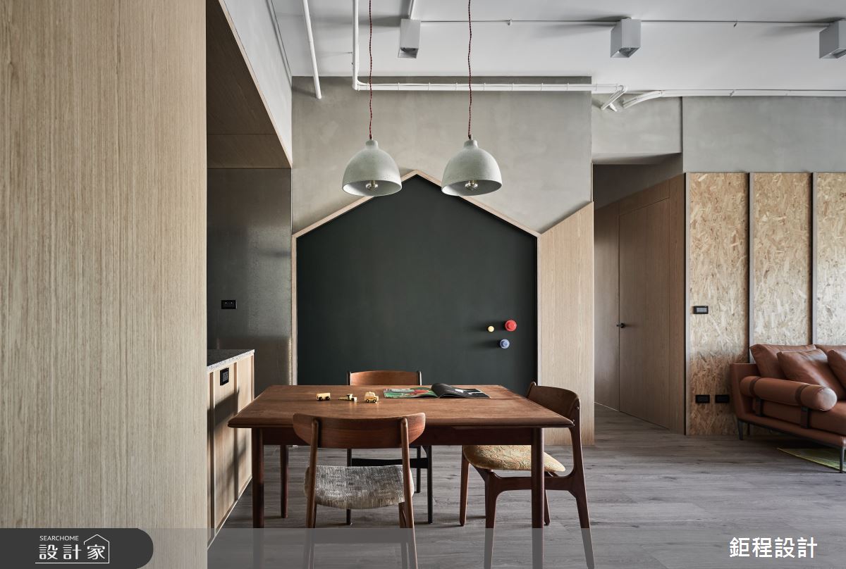 鉅程設計以超耐磨木地板、鐵件、木作貼皮、水泥/水泥粉光、水磨石、OSB板的搭配應用,呈現混搭風居家氛圍,將此間35坪、兩房、單層、新成屋(5年以下)打造成舒適愜意的家庭空間,完成2位大人、2位小孩全家人的夢想之居。
