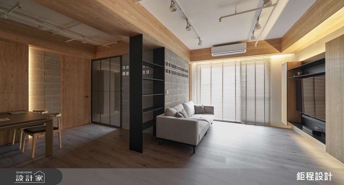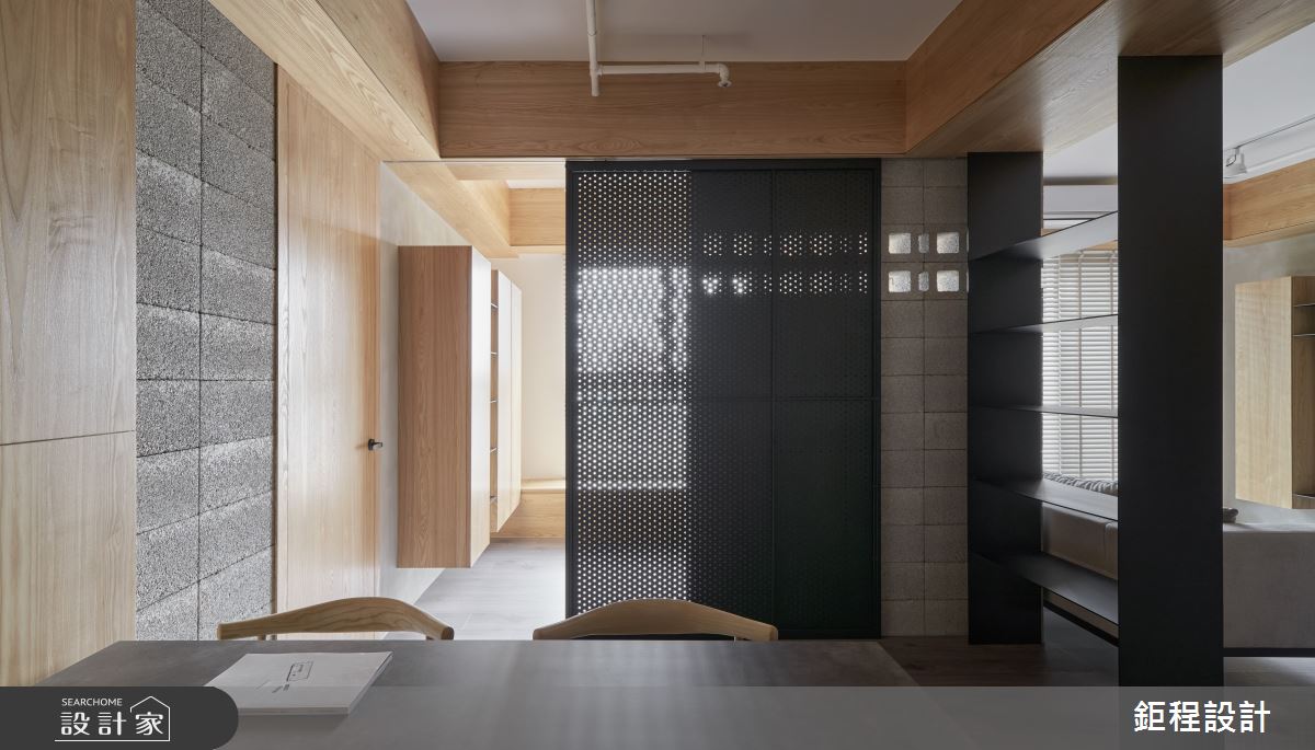 來自鉅程設計的35坪混搭風住宅案,屋主一家人共有2位大人,是一間單層新成屋(5年以下)的兩房格局,設計師藉由建材以超耐磨木地板、鐵件、木作貼皮、噴漆、沖孔板、空心磚、金屬網玻璃的搭配應用,實現一家人的理想生活。