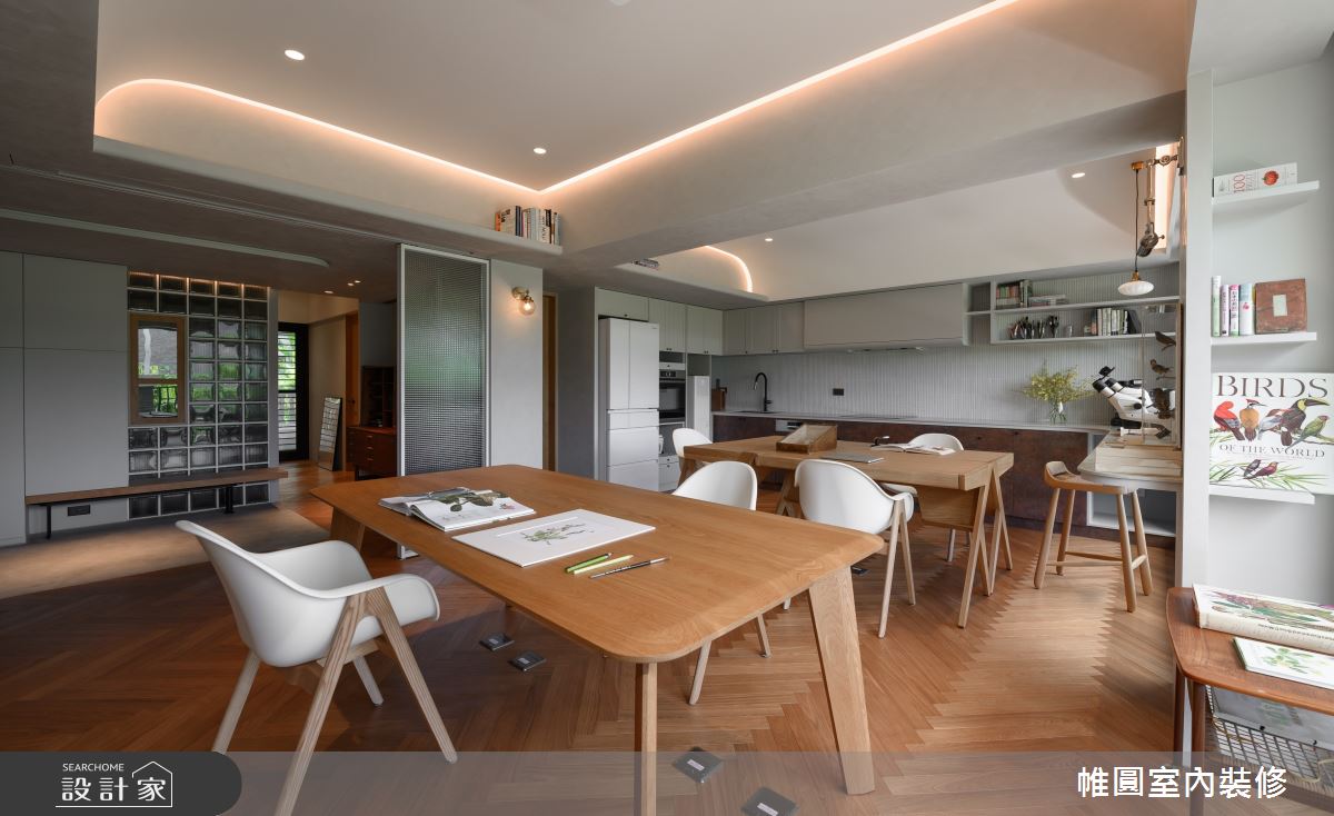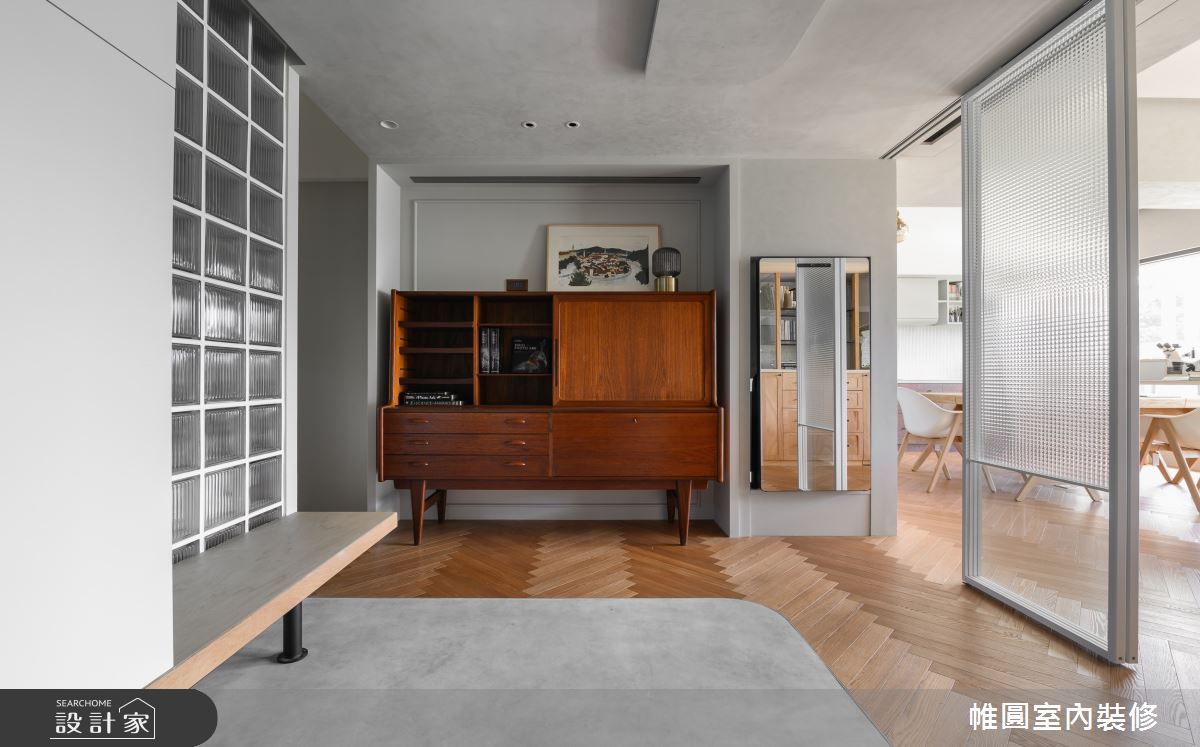 帷圓‧定制 circle以大理石、線板、進口花磚、實木、魚骨拼的搭配應用,呈現混搭風居家氛圍,將此間35坪、兩房、單層、中古屋(5~15年)打造成舒適愜意的家庭空間,完成2位大人全家人的夢想之居。