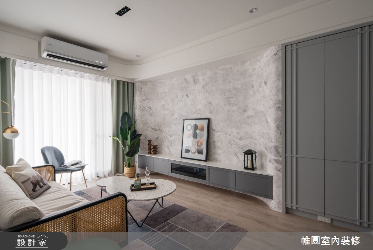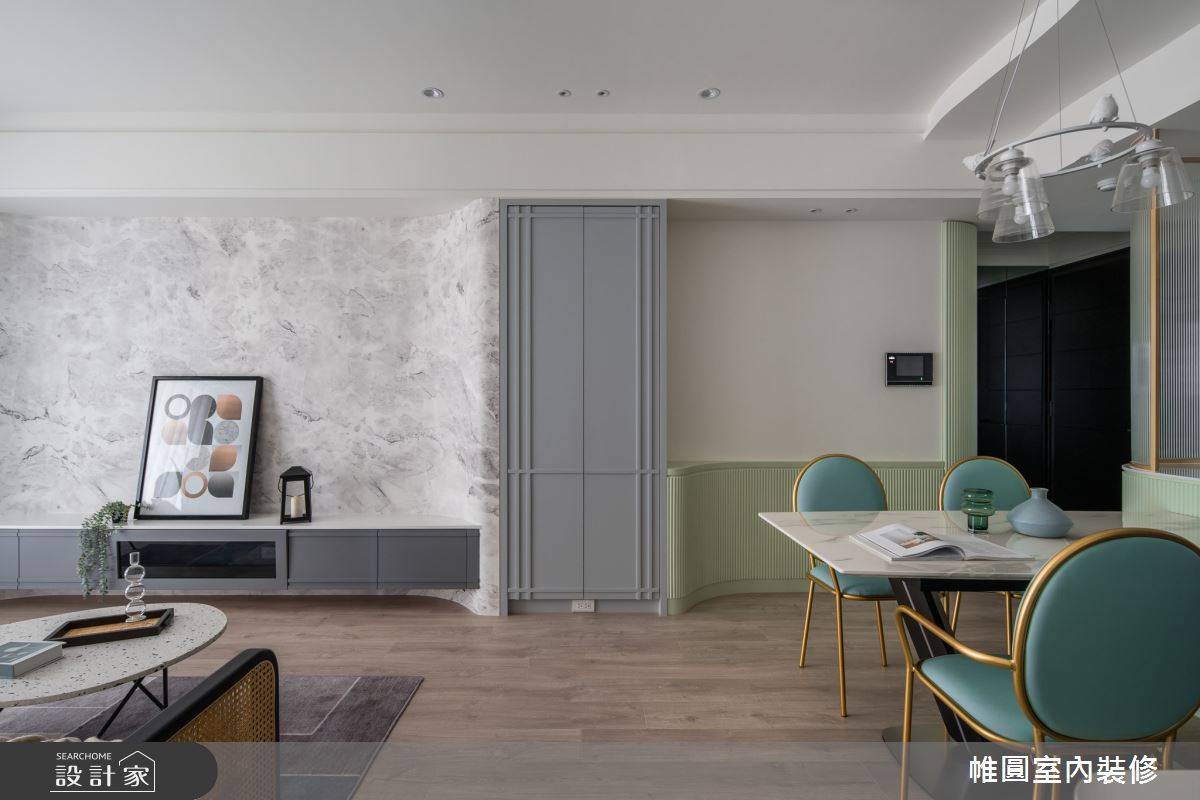 帷圓室內裝修有限公司以木地板、木作貼皮、烤漆、大理石、線板的搭配應用,呈現現代風居家氛圍,將此間65坪、四房、單層、新成屋(5年以下)打造成舒適愜意的家庭空間,完成2位大人、2位小孩全家人的夢想之居。