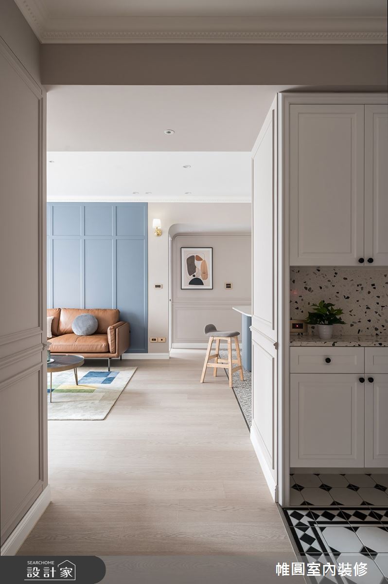 本案為帷圓室內裝修有限公司的45坪英式風新成屋(5年以下)設計作品,格局為單層三房的居住空間。居住成員包含2位大人、2位小孩。全室建材的搭配,應用花磚、線板、水磨石,展現溫馨的居家氛圍。