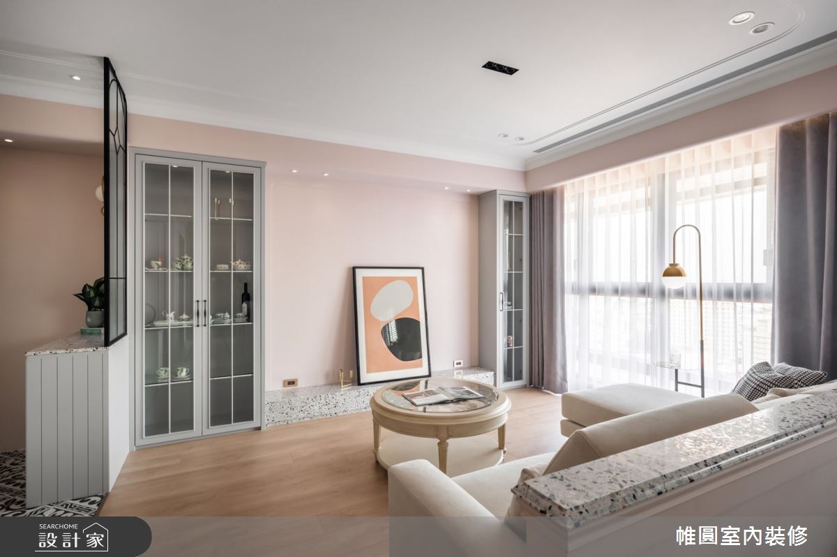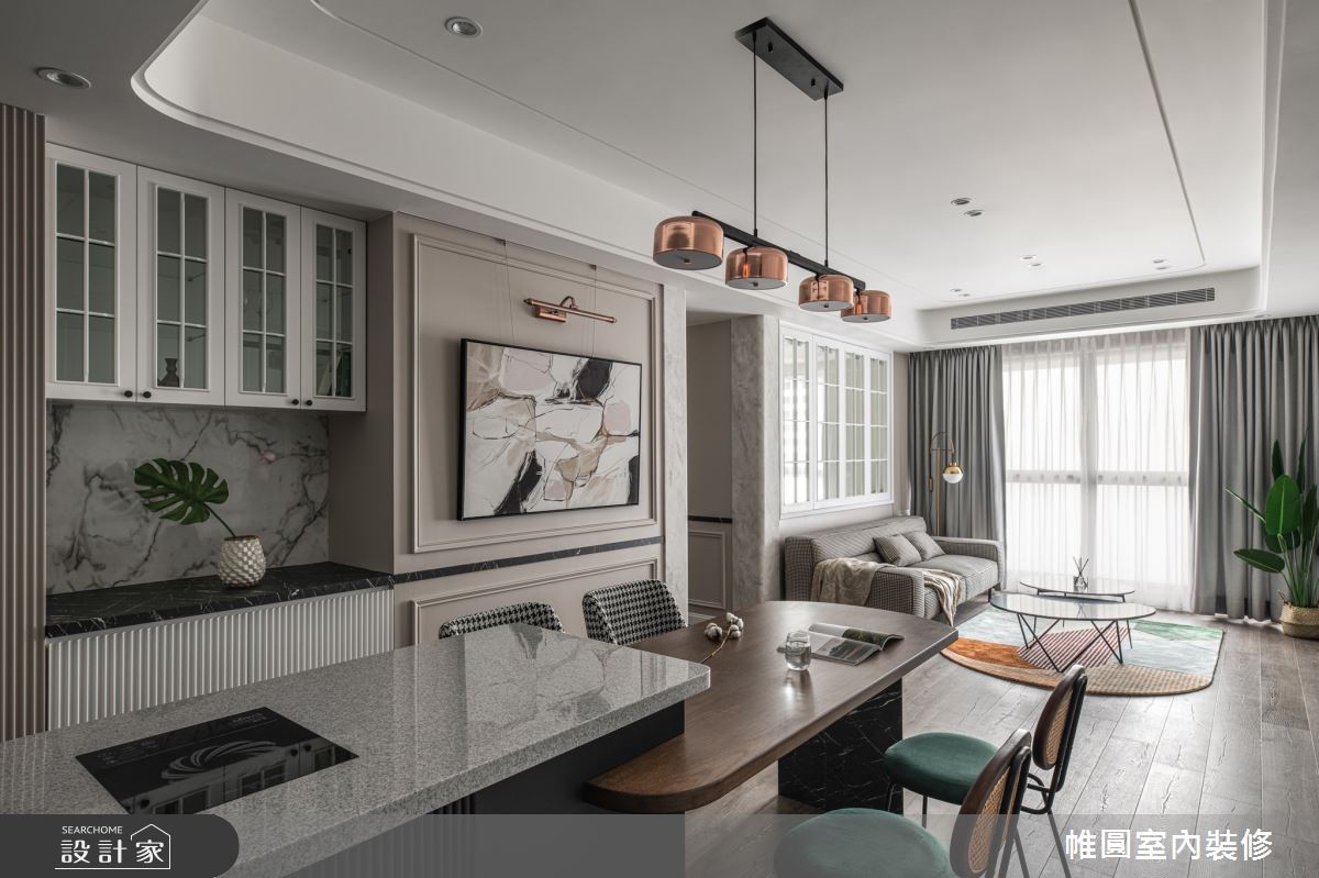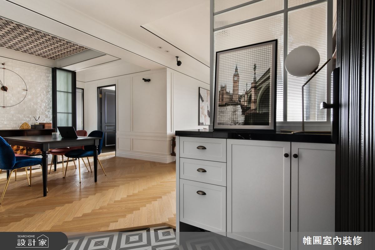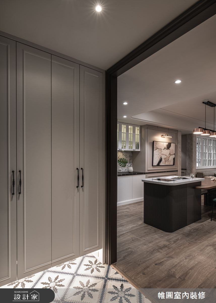 由帷圓室內裝修有限公司精心規劃的42坪三房住宅空間。因應屋主需求,設計師運用美式風作為主軸,搭配花磚、線板、水磨石、長虹玻璃,打造全家人的夢想家居。
