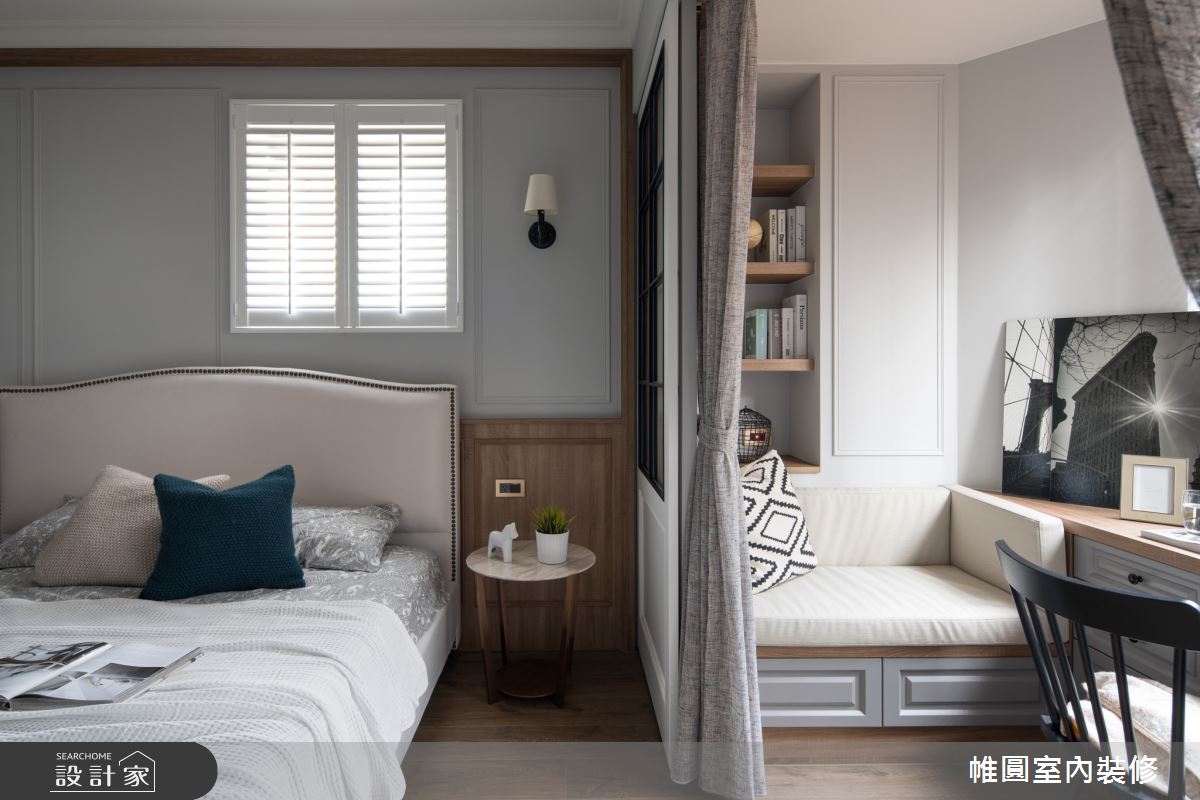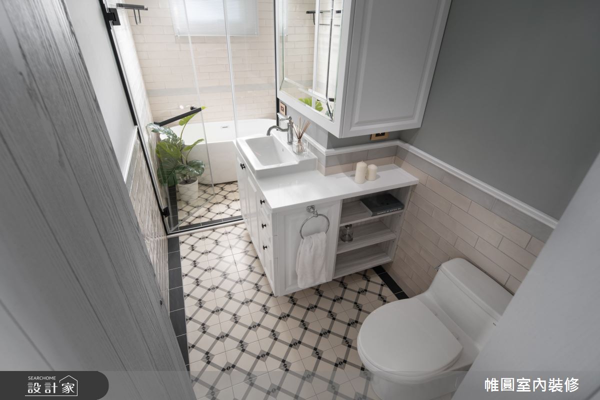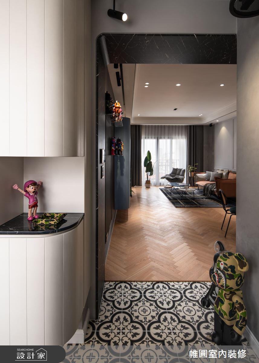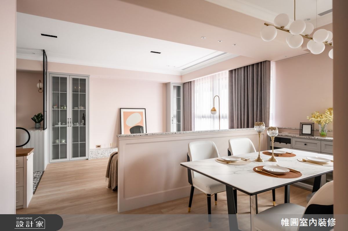 由帷圓室內裝修有限公司精心規劃的42坪三房住宅空間。因應屋主需求,設計師運用美式風作為主軸,搭配花磚、線板、水磨石、長虹玻璃,打造全家人的夢想家居。