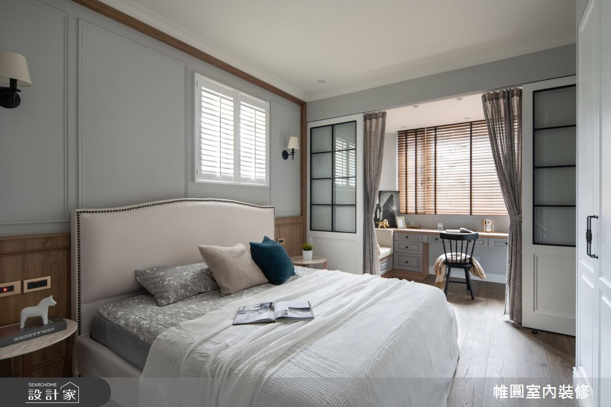 本案為帷圓室內裝修有限公司的48坪美式風新成屋(5年以下)設計作品,格局為單層三房的居住空間。全室建材的搭配,應用花磚、海島型木地板、大理石、線板,展現溫馨的居家氛圍。