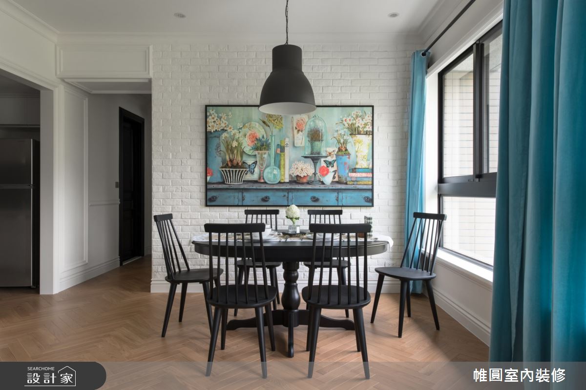 來自帷圓室內裝修有限公司的80坪鄉村風住宅案,是一間單層新成屋(5年以下)的四房格局,設計師藉由建材以花磚、海島型木地板、線板、水磨石的搭配應用,實現一家人的理想生活。