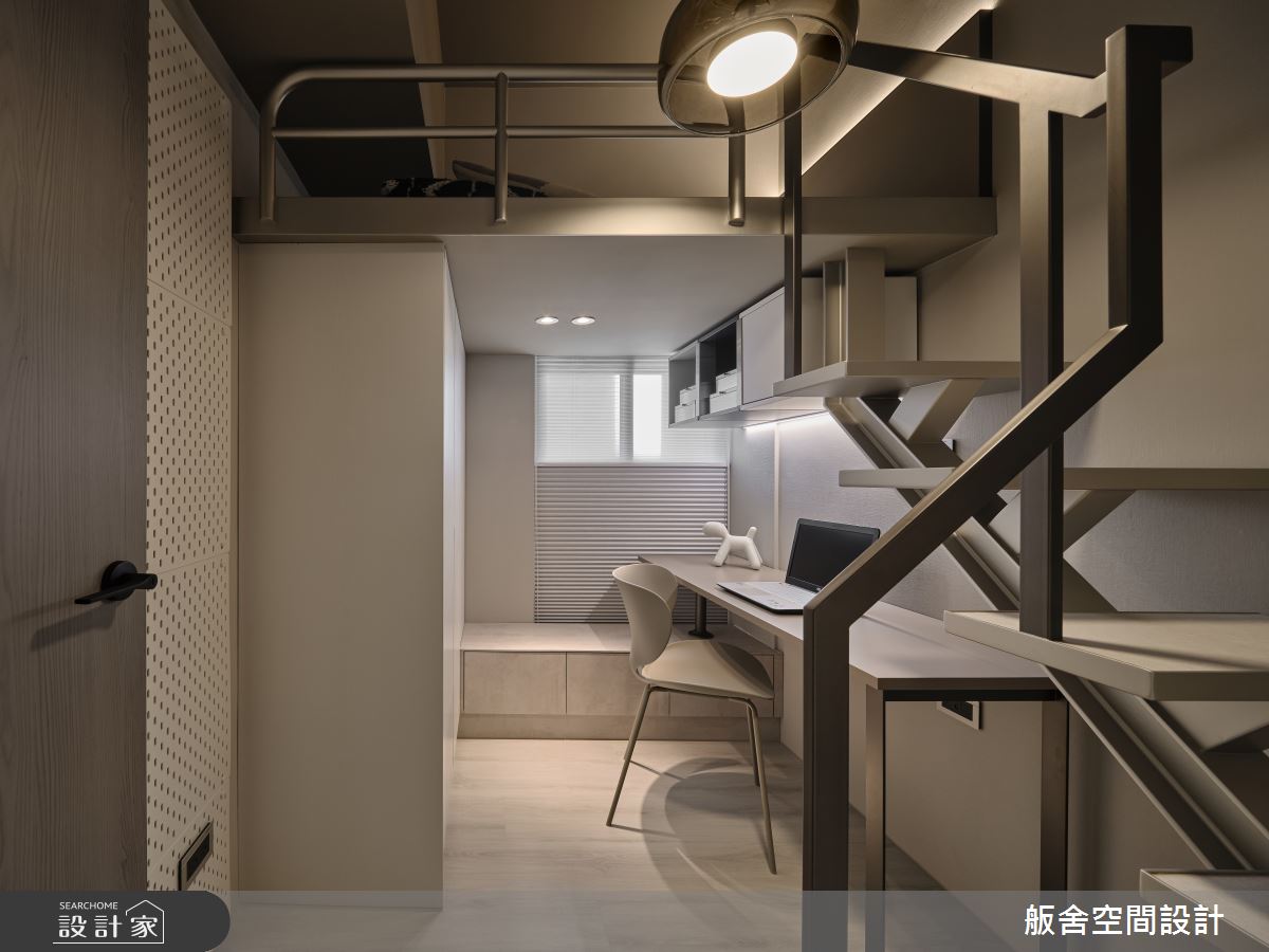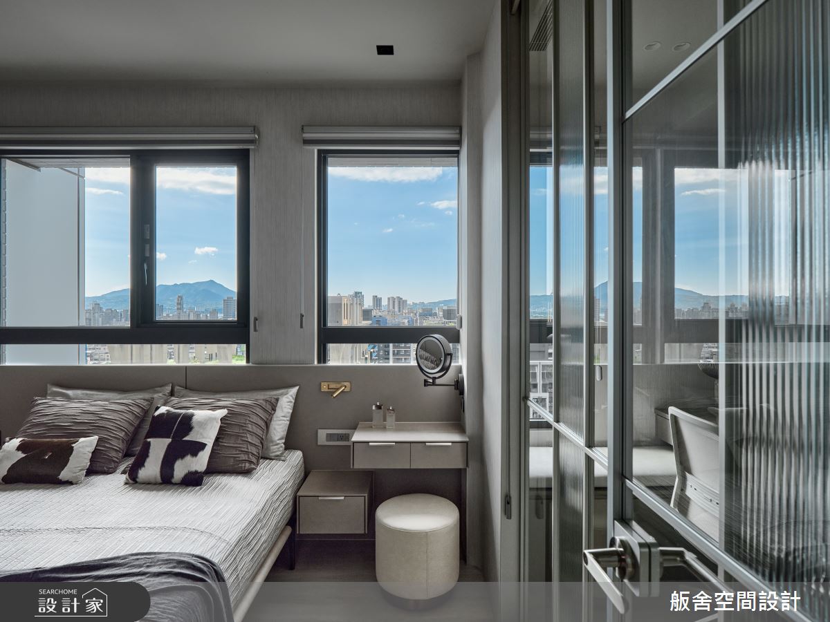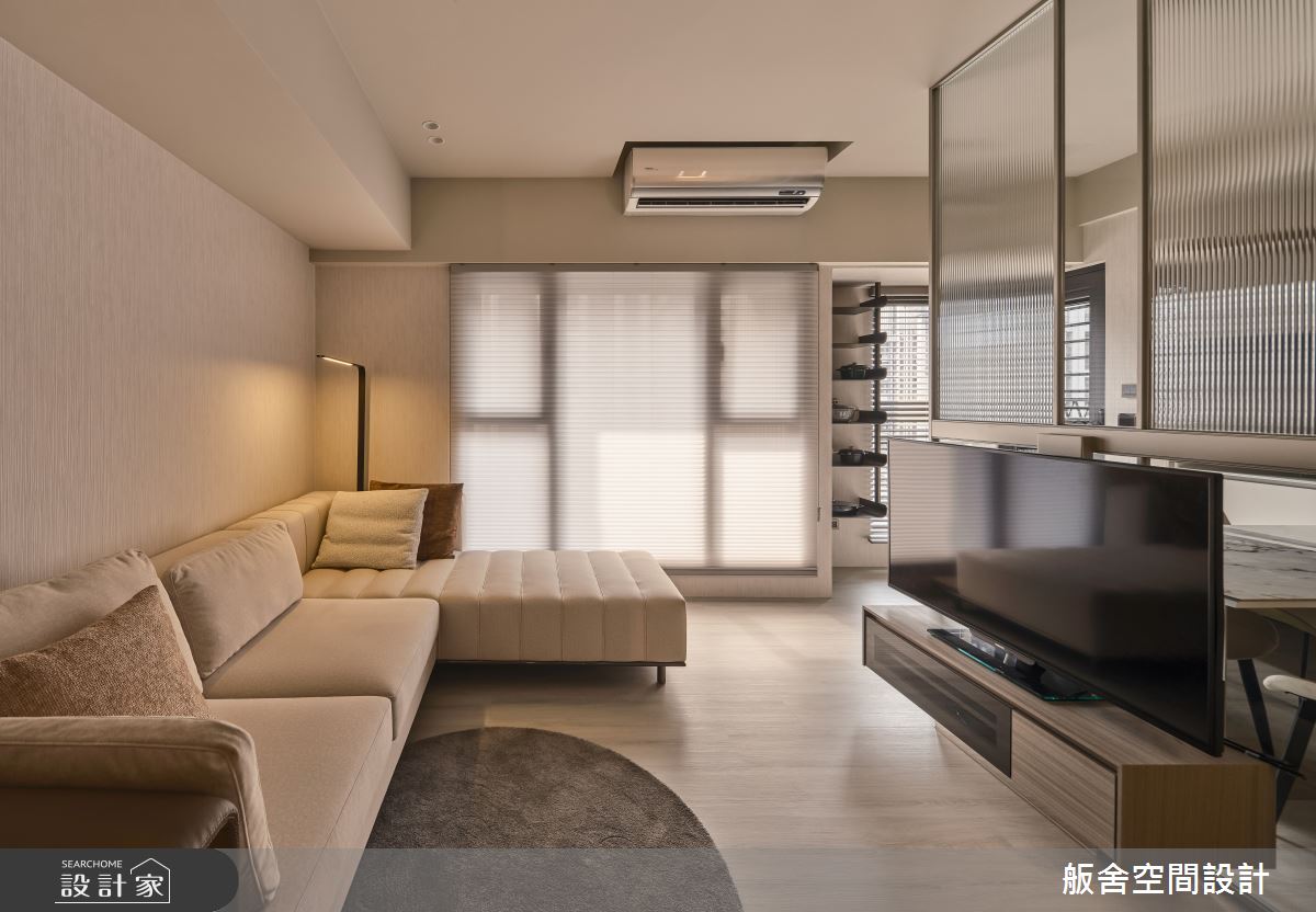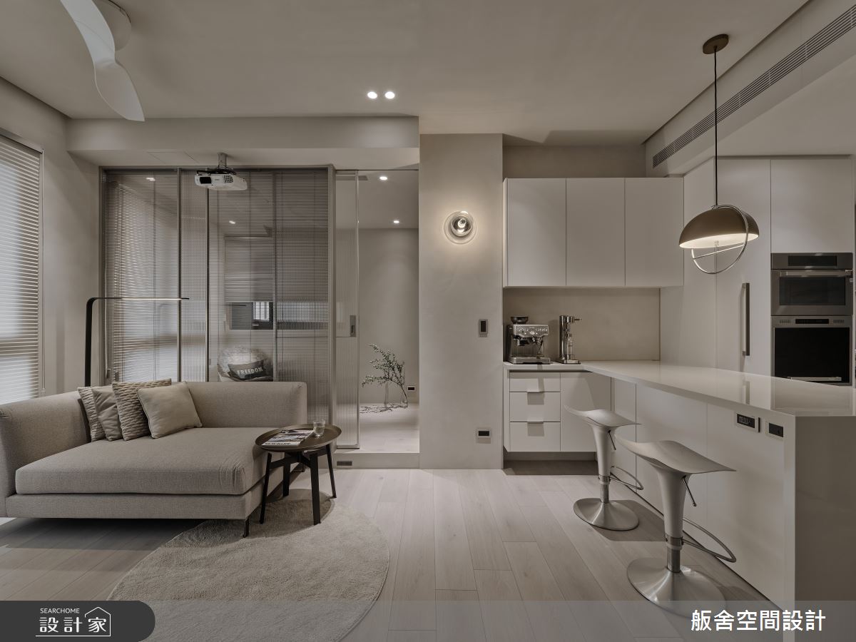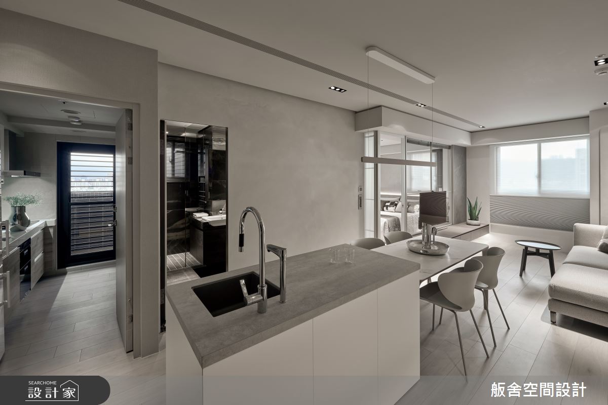 來自舨舍空間設計的21坪現代風住宅案,屋主一家人共有2位長輩,是一間單層預售屋的三房格局,設計師藉由建材以乳膠漆、壁紙、大圖輸出、PVC地板、鐵件、烤玻、鍍鈦金屬、木作貼皮、系統板材、磁磚、木百葉、皮革、石材、繃布的搭配應用,實現一家人的理想生活。