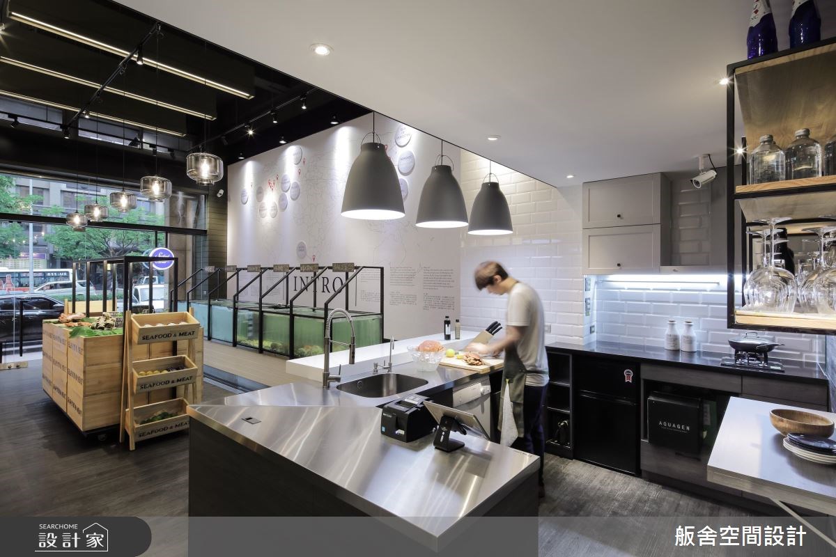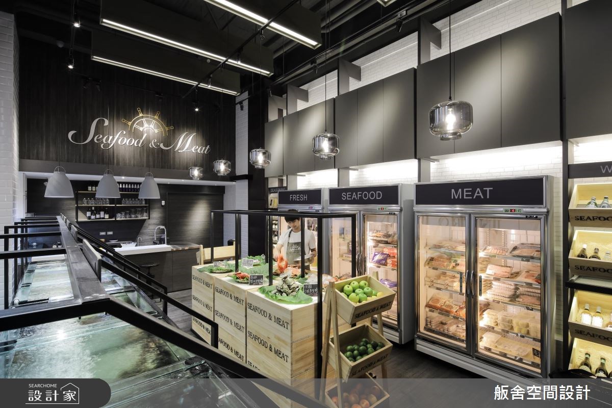 此案為中古屋翻新成海鮮超市的案例,以黑白色調作為空間基底,對比的色彩運用,加上透亮吊燈質感的點綴,賦予視覺新意。 藉由6米的天花板高度,黑色調飾底,結合倒L型的金屬柱列與木垂板燈,讓16坪的室內空間更顯開闊與氣勢,其中垂掛一整排輕透玻璃質感的燈飾,注入輕透的沁涼氣息。深色木作背板印上品牌LOGO,打造吧檯工作區,同時成為空間的主視覺;動線隔局上,中央以淺色木箱展示與大型木箱陳列出水果與最新海鮮,視覺上一目了然!左側的海水養殖缸則是設計上的一大挑戰,如何將完善的排水系統結合俐落造型的魚缸,最後以鐵件勾勒出斜梯的造型,不僅滿足視覺美感,同時展現缸內充滿活力的海鮮;右側以冰箱陳列為主,上方串連整排櫃體,滿足商用賣場空間所需的物件與備品收納。 小編的最愛 靠近魚缸的壁面以白色調為底,將海鮮產出的國家標示在世界地圖上,一展遼闊的世界觀,伴隨嵌燈的映照下,烘托出視覺焦點。