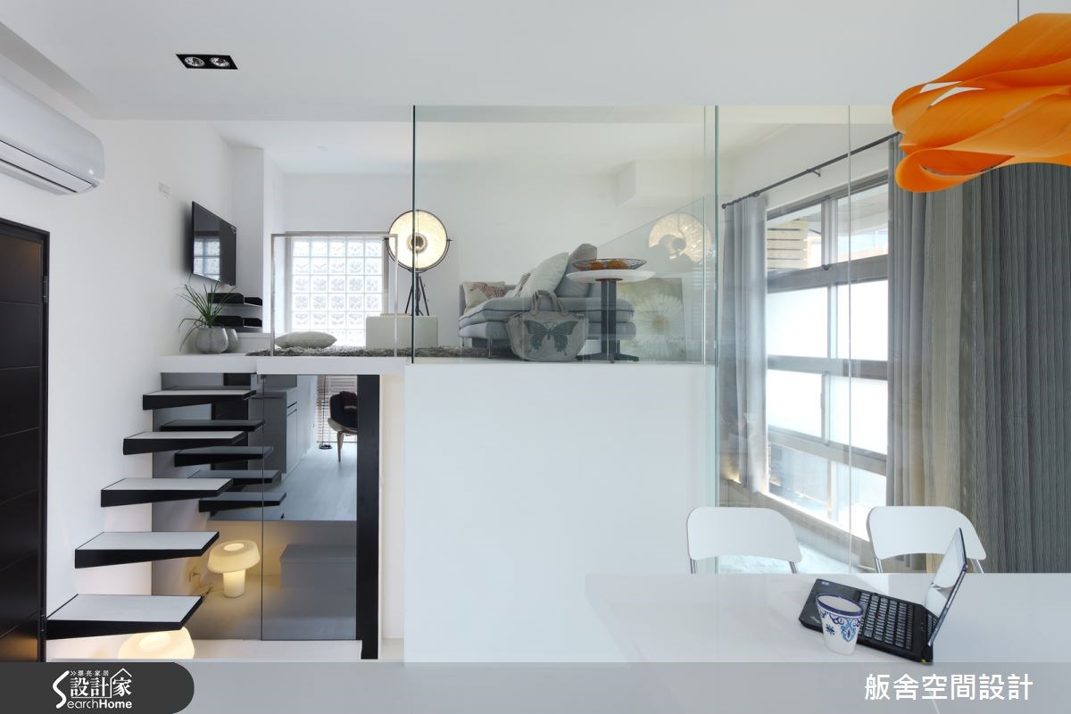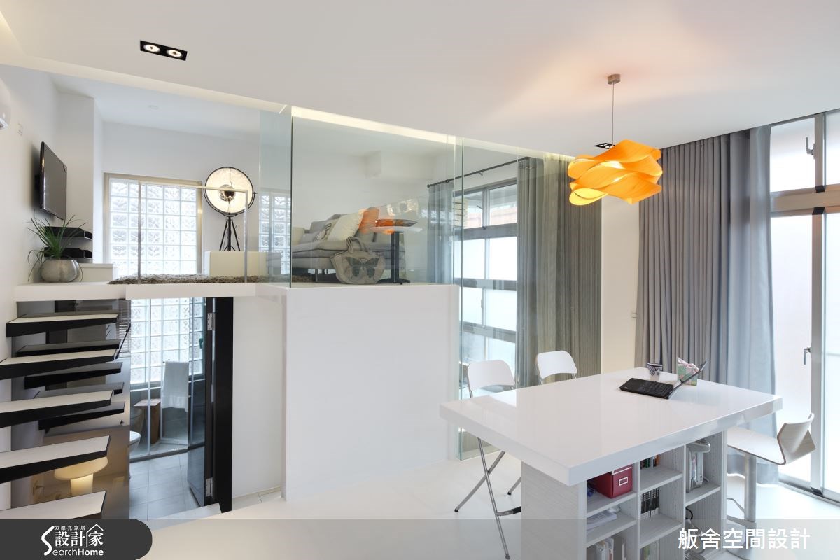 誰說坪數不大就意味著居家環境肯定擁擠呢?位於台北市的 13 坪的新成屋,本身即具備了採光度高與格局方正的優良條件,不過礙於坪數,屋主對於空間配置仍感到困擾,希望透過設計師的創意與專業來達到多功能收納且有效利用空間之成效。 為符合屋主的喜好,空間配色以白色為主軸,藉由此單一色調的使用,讓整體更加寬敞明亮,再輔以橘黃的木皮吊燈作為亮點,柔化整體環境;廚房區的長桌不僅是用餐地方,亦兼具了酒吧和工作桌之功能,且下方蘊藏著收納櫃設計,使整體具極佳的多功能性。設計師稍微降低了廁所整體的高度,刻意規劃出另一小夾層客廳,利用玻璃與鐵件欄杆扶手作為夾層四周的屏障,且玻璃與金屬的透光性,讓空間能一眼望穿不受侷限;延續空間內的通透感,夾層階梯使用鐵件踏板呈現出時尚的漂浮感,為解決踏板支撐性的問題,將膨脹螺絲打入灌漿牆內,使其更加堅固耐用。 小編最愛 設計師善用空間,特別規劃出夾層客廳,讓 13 坪數的空間也能享有兩廳,加上大量使用單一色系與玻璃透視做輔助,減少屋內的間隔感,讓整體空間在視覺上更顯寬闊許多呢!