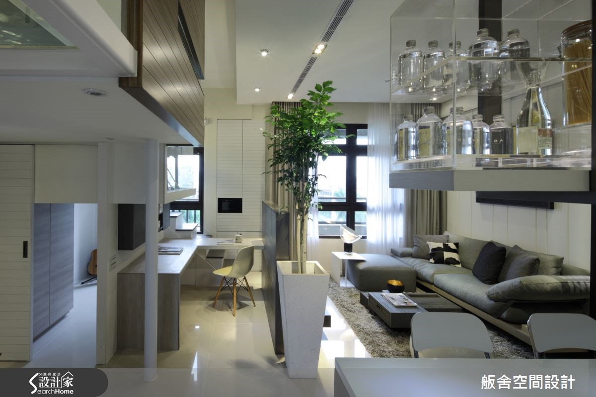 20 坪夾層新婚宅,從中島吧檯、書房到寢臥,每一機能與細節均完全貼近夫妻二人的生活習慣,尤其極簡現代的中性底韻,更是出自女主人的指定風格,搭配著設計師的美學思維,將小小的空間打造成俐落有型的居住場域,快跟著小編一起來看看吧! 設計師善用挑高四米的優勢,採木百葉搭佐清玻璃型構隔間,增添上下層的視覺通透感,並挹注極簡與工業風元素,引用純白文化石及陽剛鐵件,創造充滿個性的低彩質感;餐廚則與中島結合,不只是女主人的料理天地,更可作為居家使用的工作檯,於中島上方增設吊架,增加收納的同時亦保有量體輕盈化;電視牆旁,則可通往書房兼客房的多功能領域,考量到未來的變因,不施作過多櫃體,讓空間更可被彈性應用;沿著階梯走上二樓,進入主臥,除了透過床頭窗援引日光,也藉由與廳區連結的窗面互通光線,營造明亮無礙的休寢氛圍,搭佐深色木紋或石材磚面的鋪敘,使小空間顯得極為俐落,坐擁著飯店套房般的高雅氣質! 小編的最愛 設計師於各角落置入植栽,以綠意匯聚視覺焦點,而低調的燈光妝點,更帶入有質感的光影情境,紛紛創造理性場域內的生動意象!