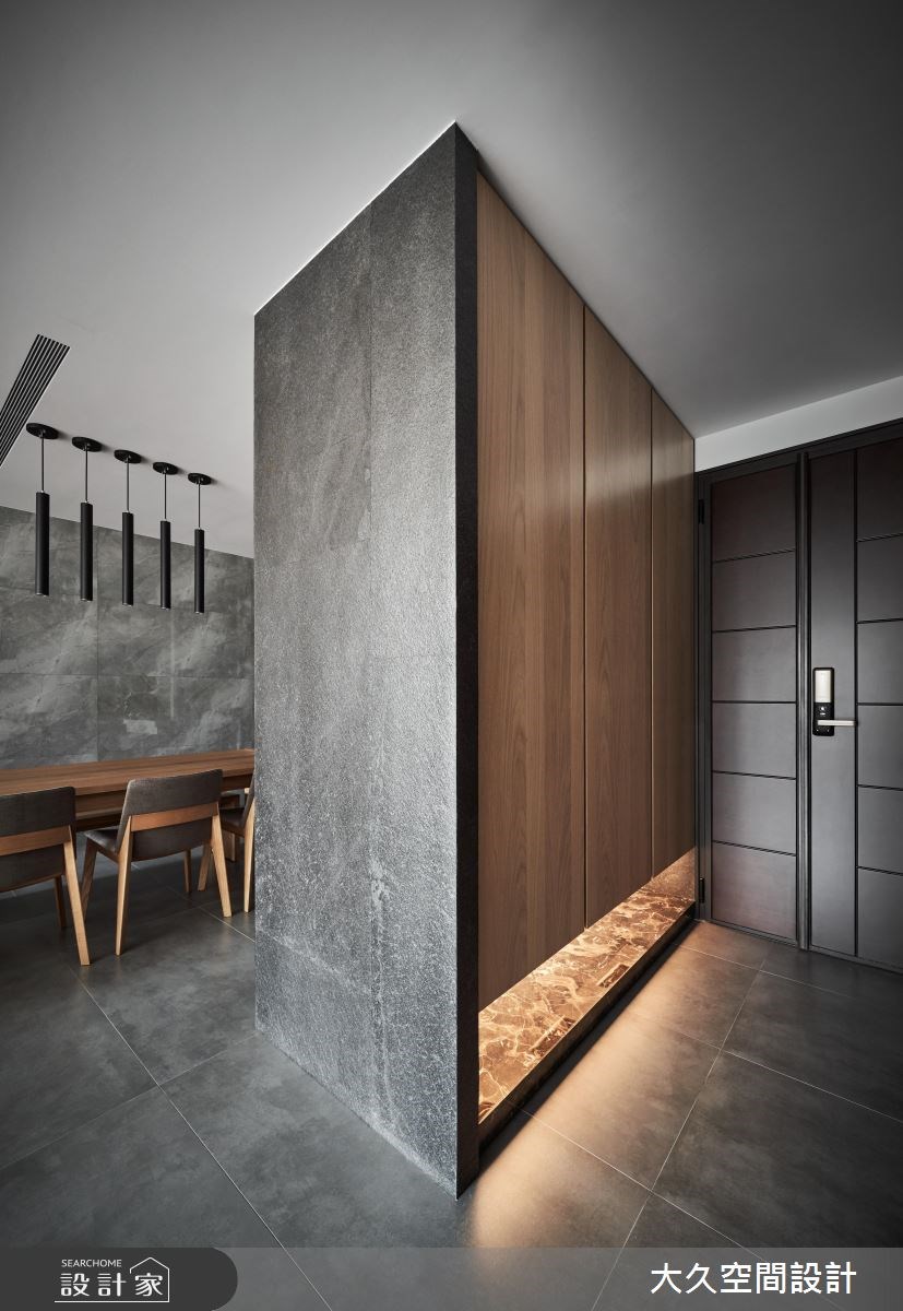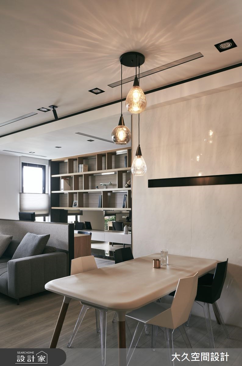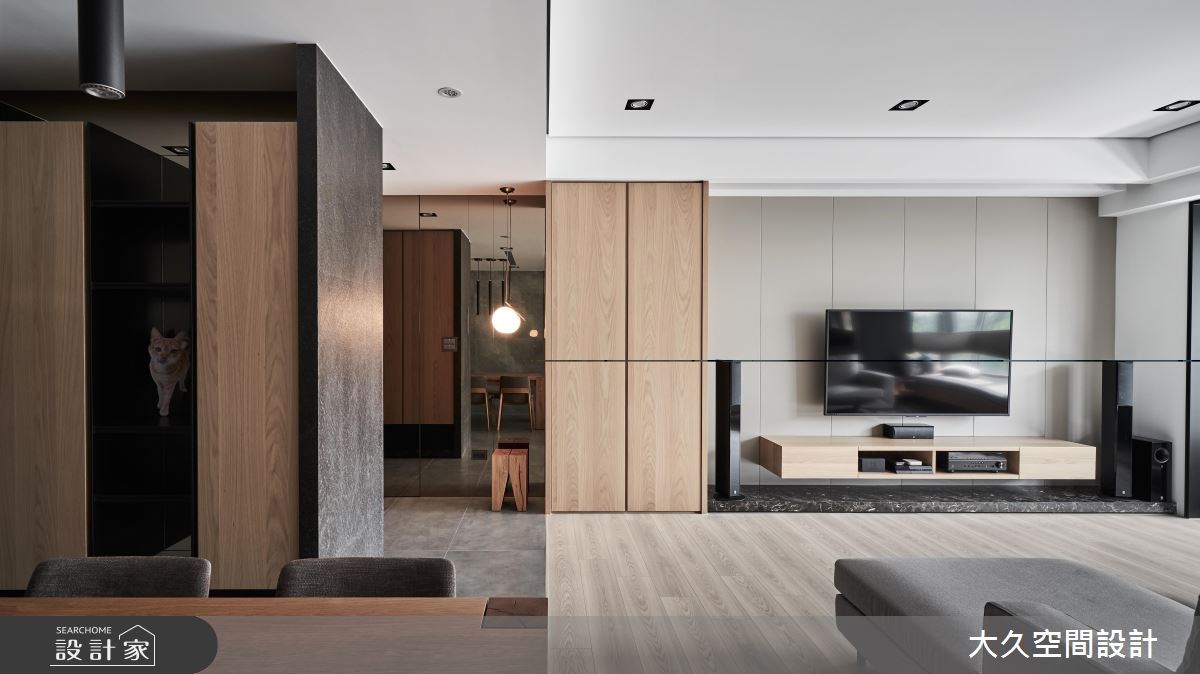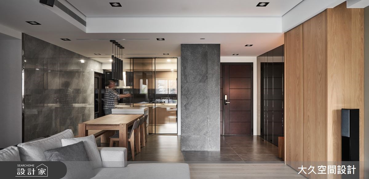 39.5 坪休閒風,木質與日光相輔相佐,照亮整室,空間視覺通透寬敞,石材與燈光的搭配設計,加乘了空間質感與層次,為休閒紓壓的場域氛圍加註輕奢質感。 玄關處收納櫃體,下方懸空的設計崁入間接光源,散發柔和視覺效果,櫃體運用與地坪相同的石灰色質材,界定出落塵區,並引導著視線延伸入後方空間。藉由視線引導,走入後方以收納櫃作為輕隔間的餐廚區,鐵件吊燈妝點出空間個性表情,壁面延續地坪質材,框出場域界線,並將空間俐落切割。跨越異質材地坪來到木質與日光包覆的客廳區,開放式設計將書房規劃於沙發後方,讓日光得以恣意流暢公共空間,平行鋪排於餐桌的設計,讓整體空間形成整齊的十字形動線。沿著空間的縱軸走進廊道,間接光源製造的柔和光線,映襯著木質格柵端景,為進入私領域鋪排了些紓壓感。延攬公共空間的沉靜質感,以石灰與木質件打造臥房空間,並適時注入色彩,提升空間活力氛圍。 小編的最愛 客廳區沿著大面玻璃窗型鋪排,擺置一長型沙發,可作為陽光臥榻角落,亦可成為沙發組的一員,開闊客廳使用範圍。