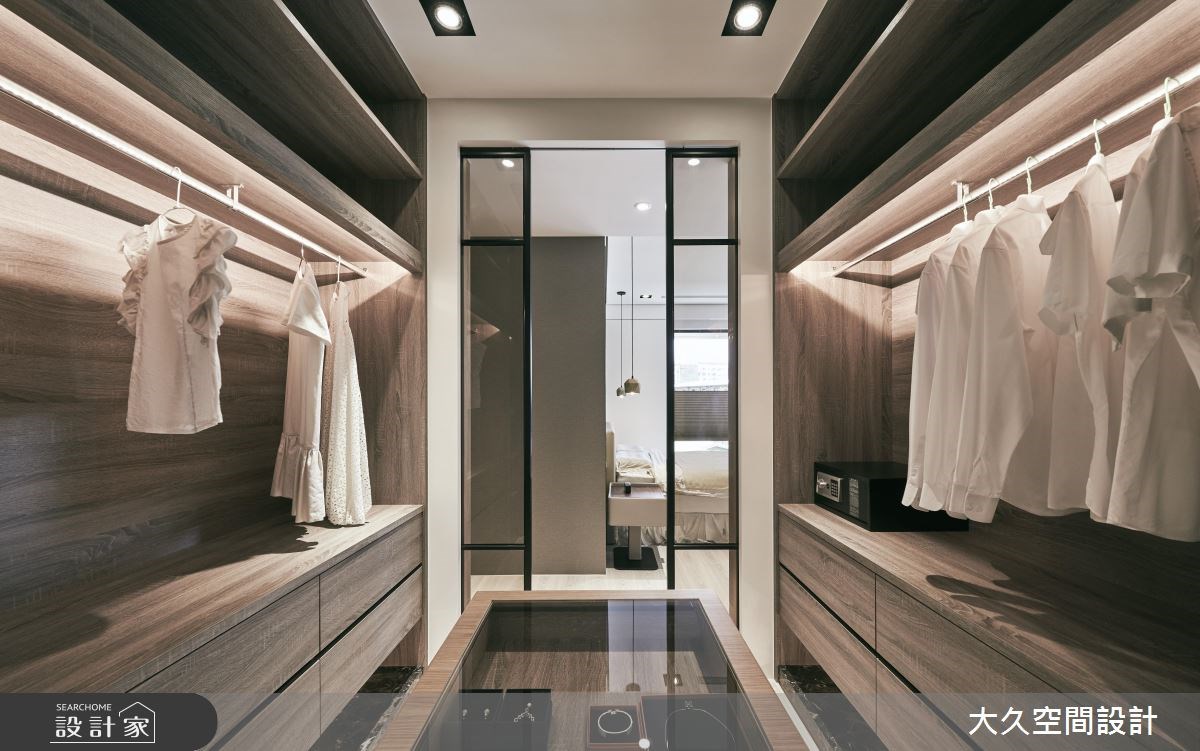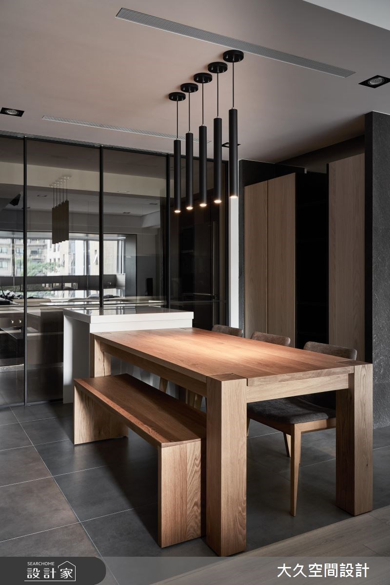 近40坪的空間裡,以大量的木紋舖敘室內風貌,伴隨落地窗引入的充沛自然光,營造出舒服、愜意的休閒氛圍,讓一家三口住得好自在、倍感溫馨。 喜歡接觸大自然的屋主,在陽台種植幾盆植物,隨著落地窗的玻璃材質透進室內,與空間裡的木紋肌理相互輝映,調和清新、療癒的氣息,且讓內外皆是宜人景緻。電視牆以岩板襯底、鐵件框出線條,結合大面積的木作收納,創造出漸層的視覺美感,同時賦予實用的收納機能;沙發一旁為開放式餐廳,現代感線條的餐桌椅靠著石材壁面擺設,天花板垂掛幾盞玻璃材質的吊燈,高低不一的安排,呈現隨性、不經意的美感氛圍,燈飾流露出晶瑩剔透的細緻光芒,讓用餐時光盡顯優雅;後方為開放式書房,木作層板拉出不同寬度的間距,隨著風格物件、書籍等擺設,豐富的端景視覺創造雅緻的人文氣息。 小編的最愛 主臥室裡以極簡的設計為主,灰、黑色調打造俐落的床頭背板造型,左側隔著玻璃拉門圍塑更衣室,精品級的空間陳列,彰顯屋主獨特的時尚品味。