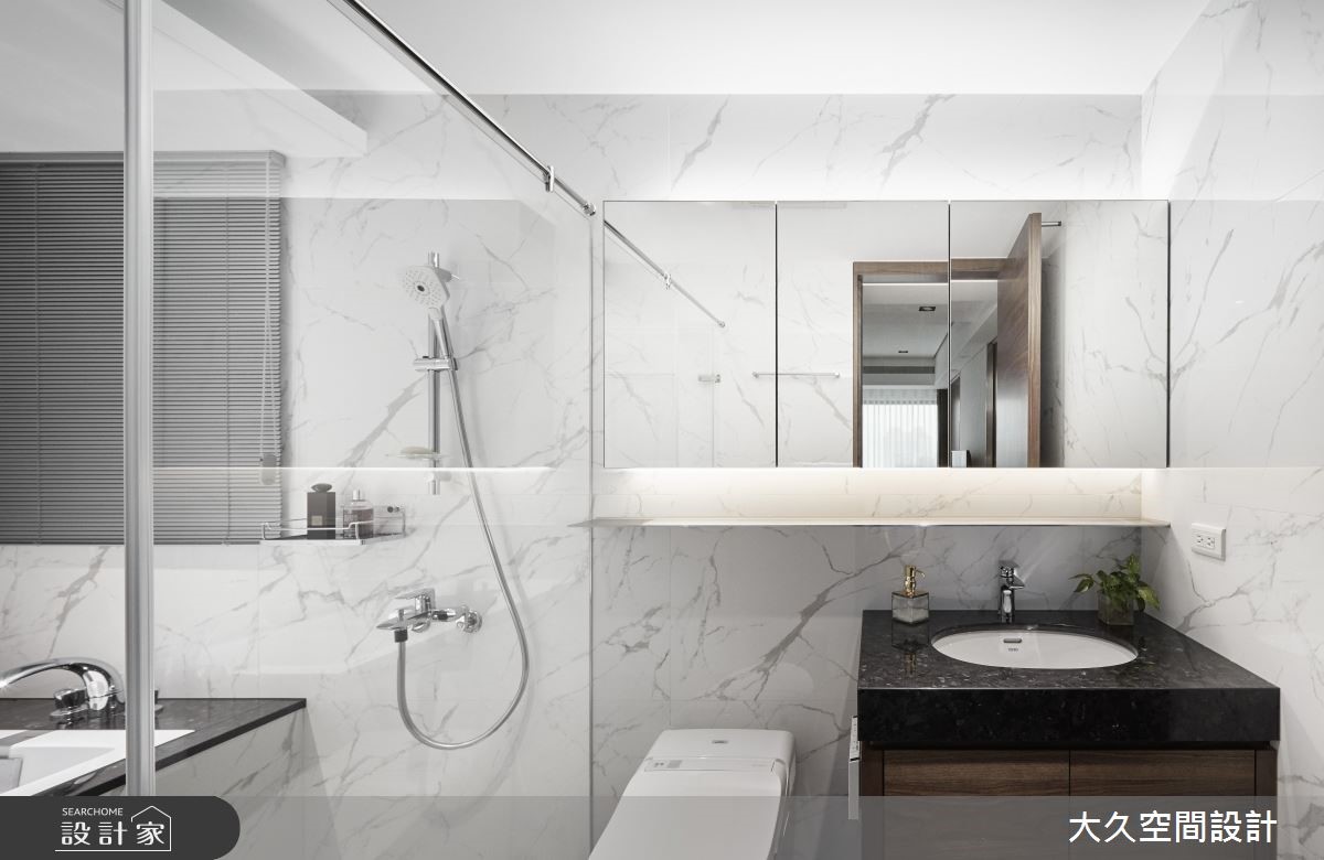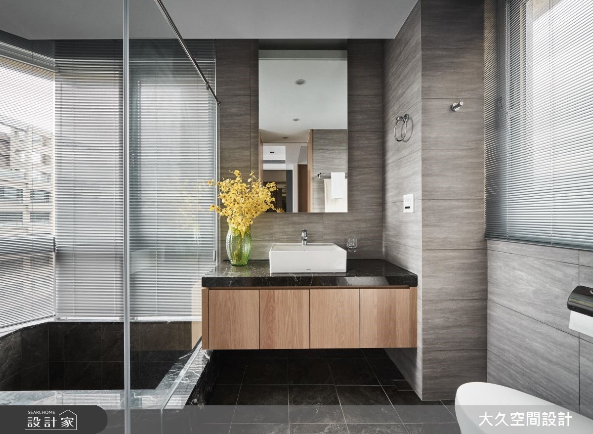 33.2 坪現代風,時尚有型、溫暖有生活感,源自於設計師巧妙應用木皮與石材穿插手法,適度地發揮兩種截然不同的元素,調整出溫暖與時尚兼容的美好生活情景。 獨立玄關場域以黑色石紋鋪陳,搭配立面深色系建材,達到一氣呵成的沉穩;進門處鋪排的整面明鏡,除了加大空間感,同時具畫龍點睛效果,為揭開低奢風格的亮點元素。從室內木地板的材質應用,可感受空間氛圍的微妙轉變,一面又一面的闊石牆應用,與電視牆、沙發背牆的石紋相呼應,延伸一進門的低奢石尚,並斟酌於細節材質的搭配,玫瑰金燈具、香檳金條飾,豐富雪白建材層次;放眼望去滿室的木質選材平衡了石材溫度,天然木皮紋理溫潤了整體生活氣氛。格局及動線配置得宜,客廳、餐廳、書房依序安排,特地選擇矮電視牆,保留三個場域的交流,書房推拉門能獨立或開放的特色,替居家空間增加一處機動地帶;低調內斂的舒適主臥,也配有私人衛浴,公、私領域皆坐擁完整且便利生活機能。 小編的最愛 主衛轉角牆面大面開窗,引入充沛日光加乘使用者放鬆度,窗邊處打造的石砌浴缸,不經意呼應了以奢華生活享受為主軸的設計理念。