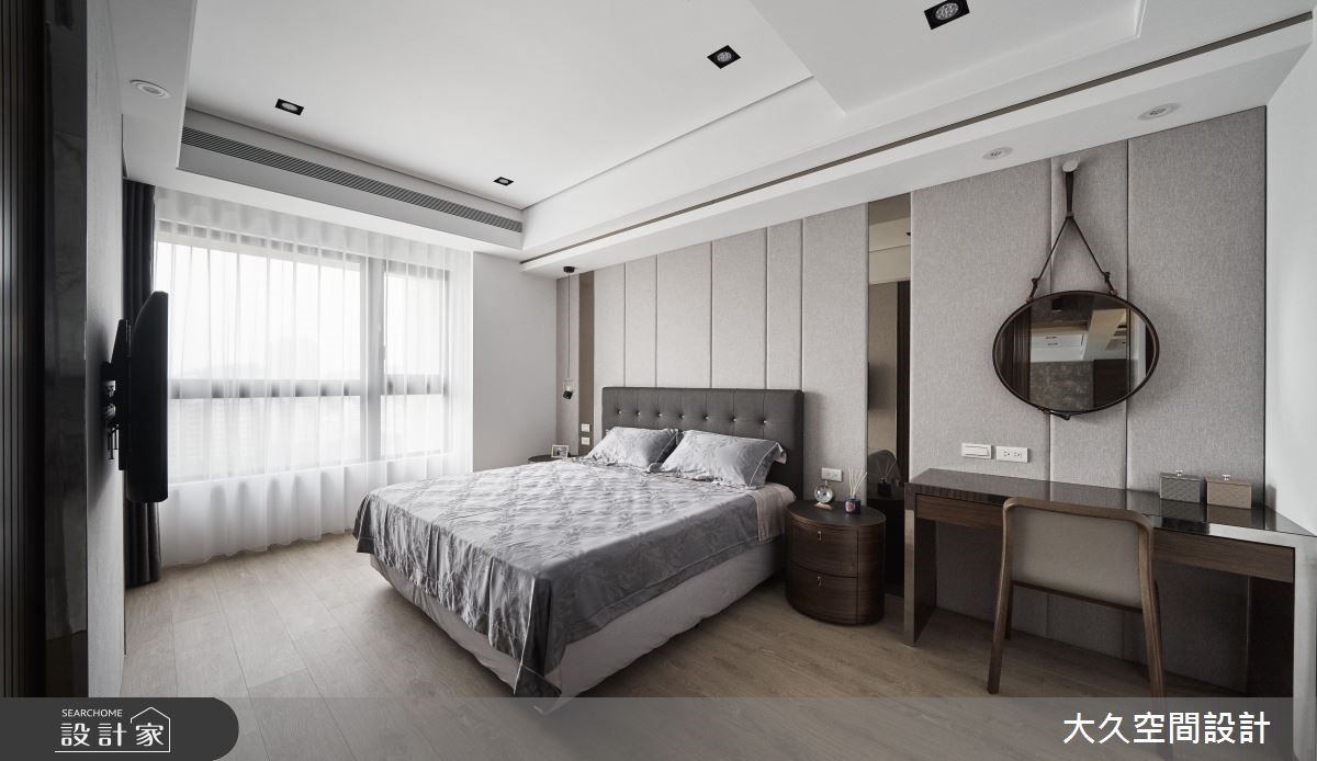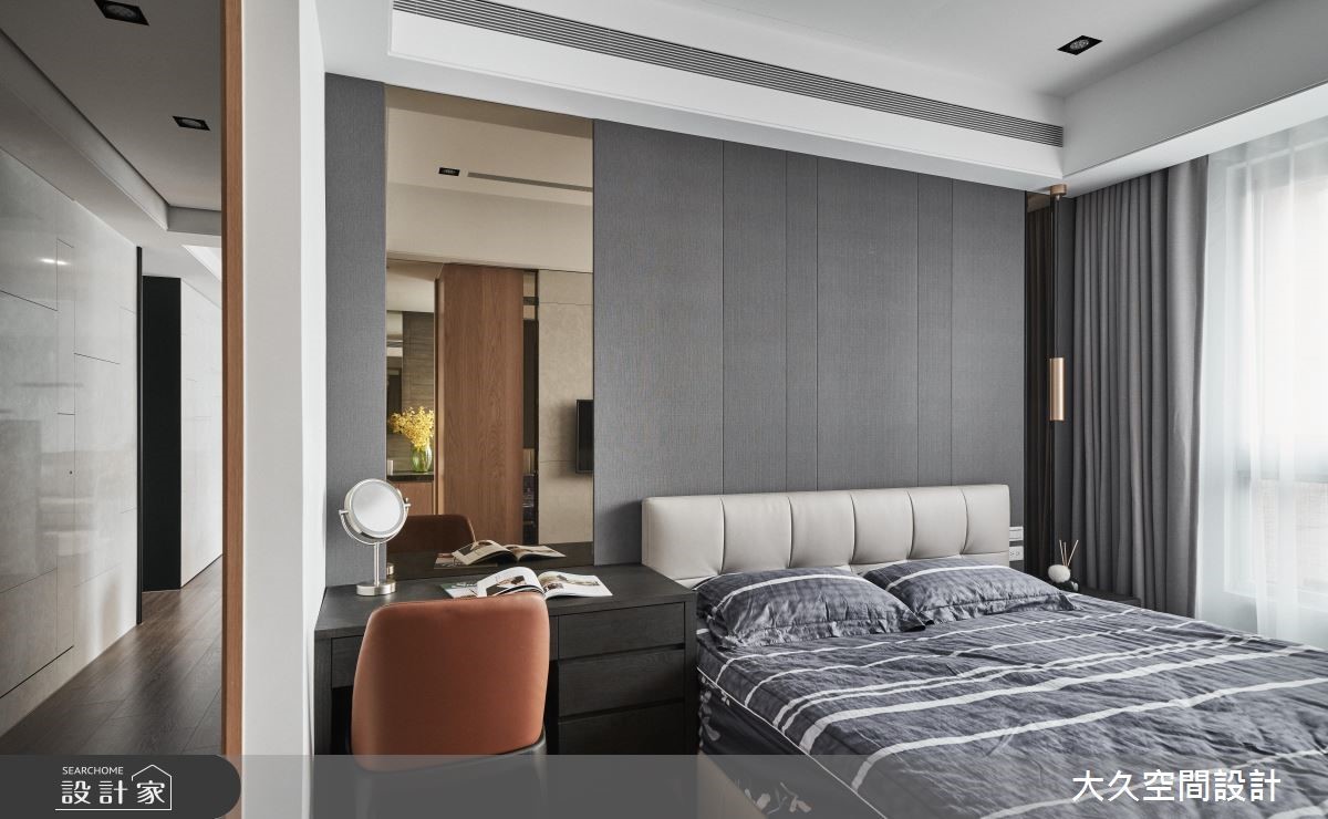 本案為大久空間設計的43坪現代風新成屋(5年以下)設計作品,格局為單層四房的居住空間。居住成員包含3位大人、1位小孩。全室建材的搭配,應用乳膠漆、壁紙、超耐磨木地板、石英磚/拋光石英磚、不鏽鋼、鐵件、灰鏡、木作貼皮、系統板材、大理石、皮革、繃布、噴漆、美耐板,展現溫馨的居家氛圍。