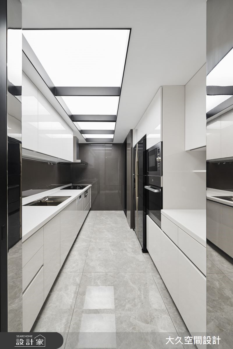 大久空間設計以乳膠漆、壁紙、超耐磨木地板、木地板、石英磚/拋光石英磚、不鏽鋼、鐵件、鍍鈦金屬、木作貼皮、大理石、磁磚、皮革、石材、繃布、噴漆的搭配應用,呈現現代風居家氛圍,將此間66坪、五房、樓中樓、中古屋(5~15年)打造成舒適愜意的家庭空間,完成2位大人、3位小孩、1位長輩全家人的夢想之居。