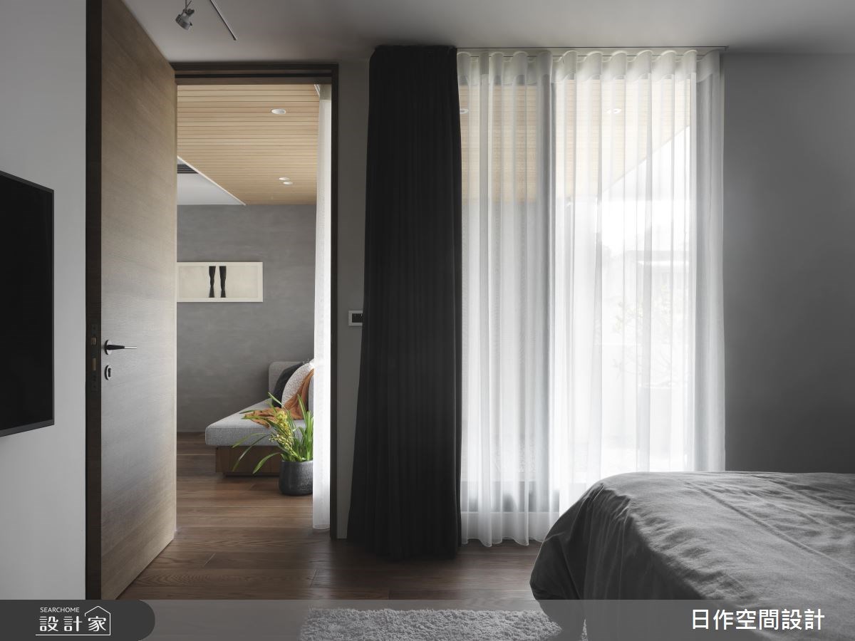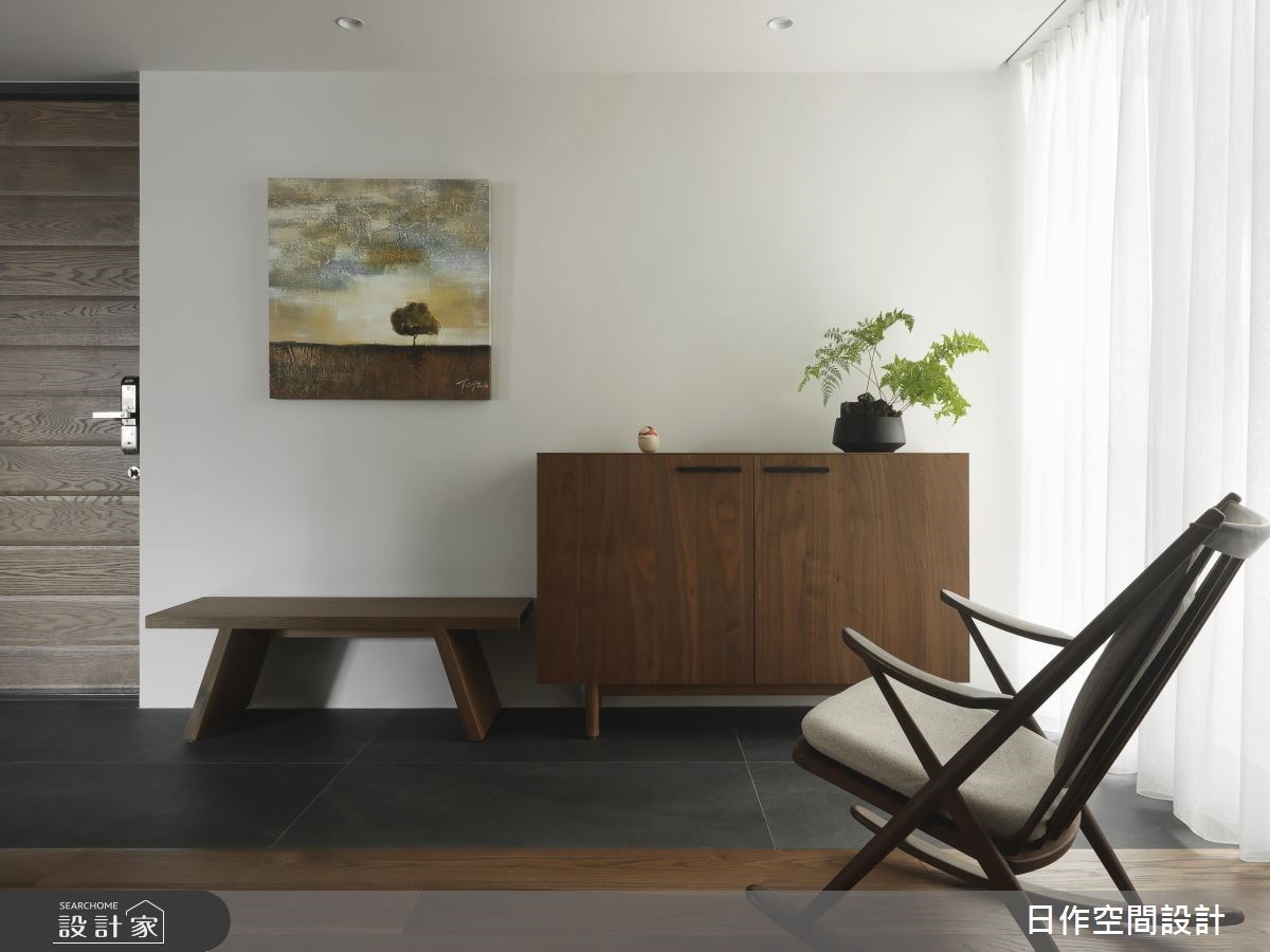 設計團隊秉持著「日出而作 ,日落而息」的座右銘,衍伸出「日作」精神,將空間化繁為簡,使紛擾世界中的居家是屋主心之所向的桃花源,創造自然清靜的所在,在 35 坪的空間中,打造了三代皆適用的溫潤木質居家。 鋪有石紋磚的寬敞玄關上方裝設大面積 L 型木質吊櫃,除了大量收納機能外,細緻的葉面與挖空展示檯面,別有一種風景;右側石材牆面給予客廳視覺上緩衝,使居住者更有隱私。日光由長型木質百葉簾幕間進入室內,為色調冷峻的清水模材質電視牆增添溫潤光芒,木紋磚搭配淺色家具與單品,突顯大方與明亮感。橫樑上鑲嵌軌道照明,成為客廳與後方閱讀空間的場域分野,相配的實木長桌與長椅與木質單椅在和煦的陽光下形成了溫暖愜意的氛圍;木感吊櫃同樣中和了清水模材質牆面的冰冷調性,是一家大小培養感情的最佳所在。 開放式空間由客廳延伸至餐廳,造型吸頂燈搭配軌道照明,給予用餐空間多元亮度,色調沉穩的牆面上鑲嵌著烤箱等器材,不僅為隱藏於門片後方的的一字型廚房拓增尺度,更成為特殊的視覺端景,讓家人體會新鮮的幸福滋味。由義大利洞石砌成的主臥床頭牆面,清淺色調為木質地面與黑色牆面兩者間的平衡,隱藏於門片後方則是以石材為主的衛浴空間。 小編的最愛 全室皆鋪設木質地面,營造適合一家大小的中性氣息,沉穩卻不顯老氣;另一方面不時以冷調材質點綴其中,製造衝突美感。
