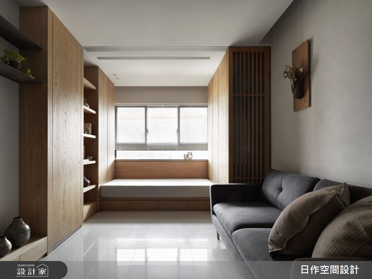 本案為日作空間設計的10.5坪人文禪風新成屋(5年以下)設計作品,格局為單層一房的居住空間。居住成員包含2位大人。全室建材的搭配,應用木作貼皮,展現溫馨的居家氛圍。