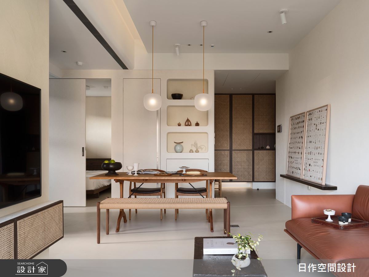 日作空間設計以稻草梗塗料、壁紙的搭配應用,呈現北歐風居家氛圍,將此間9.63坪、一房、單層、預售屋打造成舒適愜意的家庭空間,完成2位大人全家人的夢想之居。
