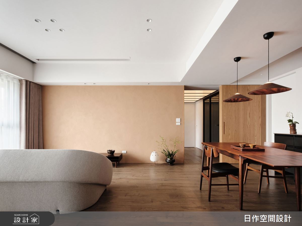 日作空間設計以石材、鐵件、超耐磨木地板、鐵平石、香杉實木、特殊塗料的搭配應用,呈現日式無印風居家氛圍,將此間45坪、三房、單層、新成屋(5年以下)打造成舒適愜意的家庭空間,完成2位大人、1位小孩全家人的夢想之居。