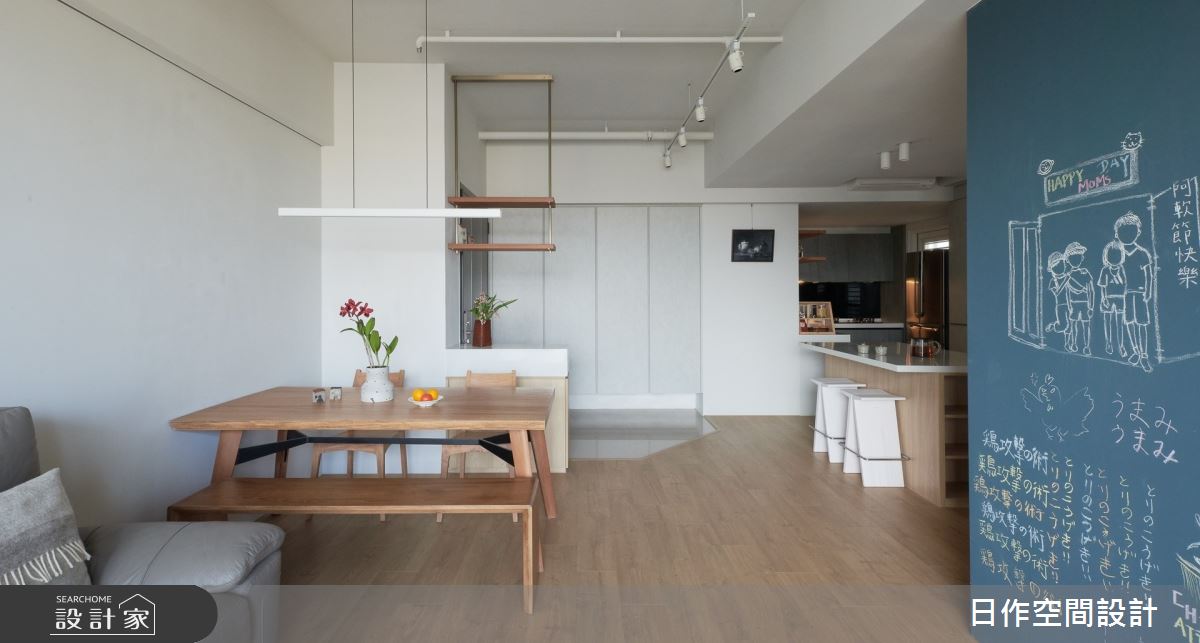 來自日作空間設計的30坪日式無印風住宅案,屋主一家人共有2位大人、2位小孩,是一間單層新成屋(5年以下)的三房格局,設計師藉由建材以磁性漆/磁性黑板漆、超耐磨木地板、系統櫃、寮國檜木實木、橡木、噴漆的搭配應用,實現一家人的理想生活。