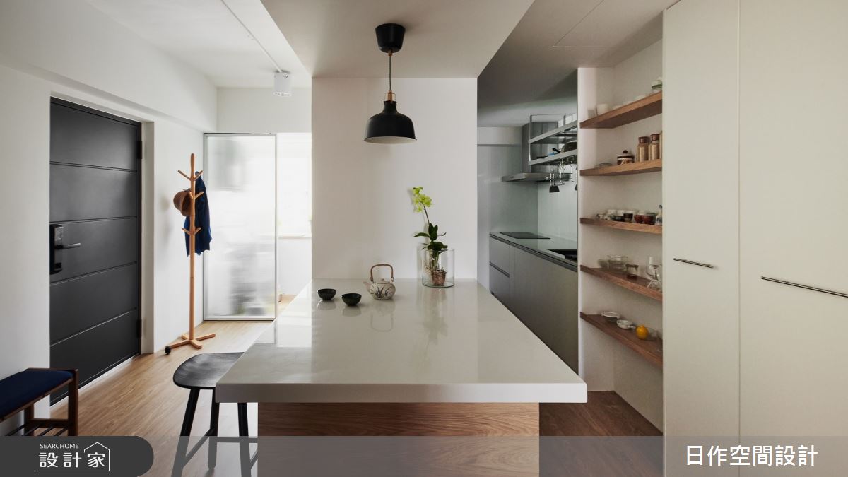 來自日作空間設計的30.6坪日式無印風住宅案,屋主一家人共有2位大人,是一間單層老屋(16~30年)的一房格局,設計師藉由建材以乳膠漆、海島型木地板、鐵件、茶玻、系統板材、人造石、噴漆的搭配應用,實現一家人的理想生活。