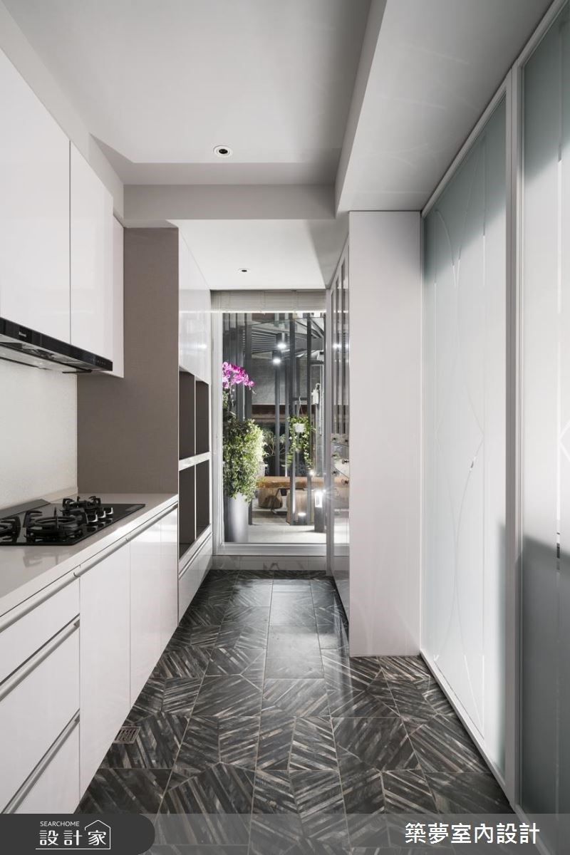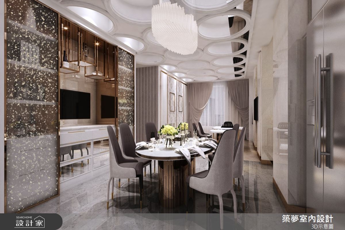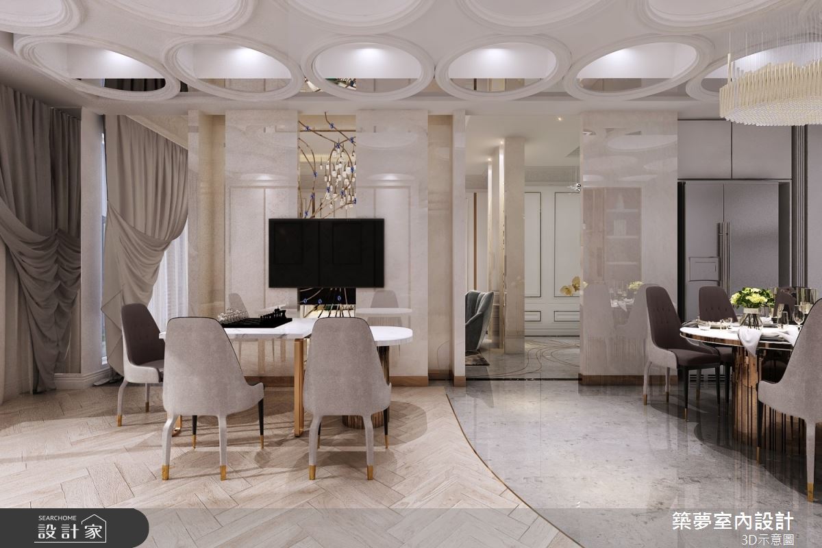 築夢室內設計以乳膠漆、烤玻、大理石、皮革、鍍鈦、進口壁布的搭配應用,呈現新古典居家氛圍,將此間25坪、一房、單層、新成屋(5年以下)打造成舒適愜意的家庭空間,完成1位大人的夢想之居。