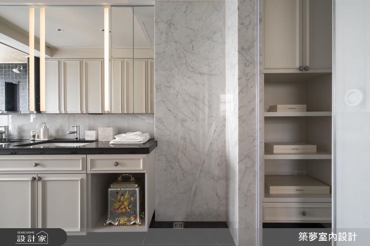 4 大 1 小的三代同堂家庭,設計師替空間加入正統的英式皇家新古典風格,並在符合風水的前提下,兼顧生活實用機能,讓每一分收納機能都面面俱到,開啟一家子的美好願景,快跟著小編一起來看看吧! 空間承襲著正統的英倫古典風,在細膩的語彙中詮釋優雅風格,同時在西式風情之中,也兼顧了傳統東方風水,達到開門不見爐灶、不壓樑等各項細節,同時配置一扇可彈性推拉的古典客製雕花屏風,屏風中段採以漸層霧玻來達到視覺柔化,搭以雕花的立體紋理,巧妙區隔出客餐廳的位置;餐廳則因空間較小,於是善用一切可利用坪效,巧妙融合所有畸零空間打造餐櫃,且巧妙結合全英式線板,讓櫃體可與周邊設計做結合,形成完整的視覺架構,再給予中島吧檯規劃以及 6 人座設定,讓一家人可在此共享天倫之樂;寢臥內,延續著線板的鋪底,凝聚清新質感,並整合櫃體、電視與梳妝檯等機能,達到屋主夢想中的風格、實用性兼具的使用情境! 小編的最愛 因應家有長輩與小孩,怕過於鋒利的稜角有礙居家安全,於是設計師刻意將線板導圓,不僅安心無虞,也達成美化空間線條的效果!