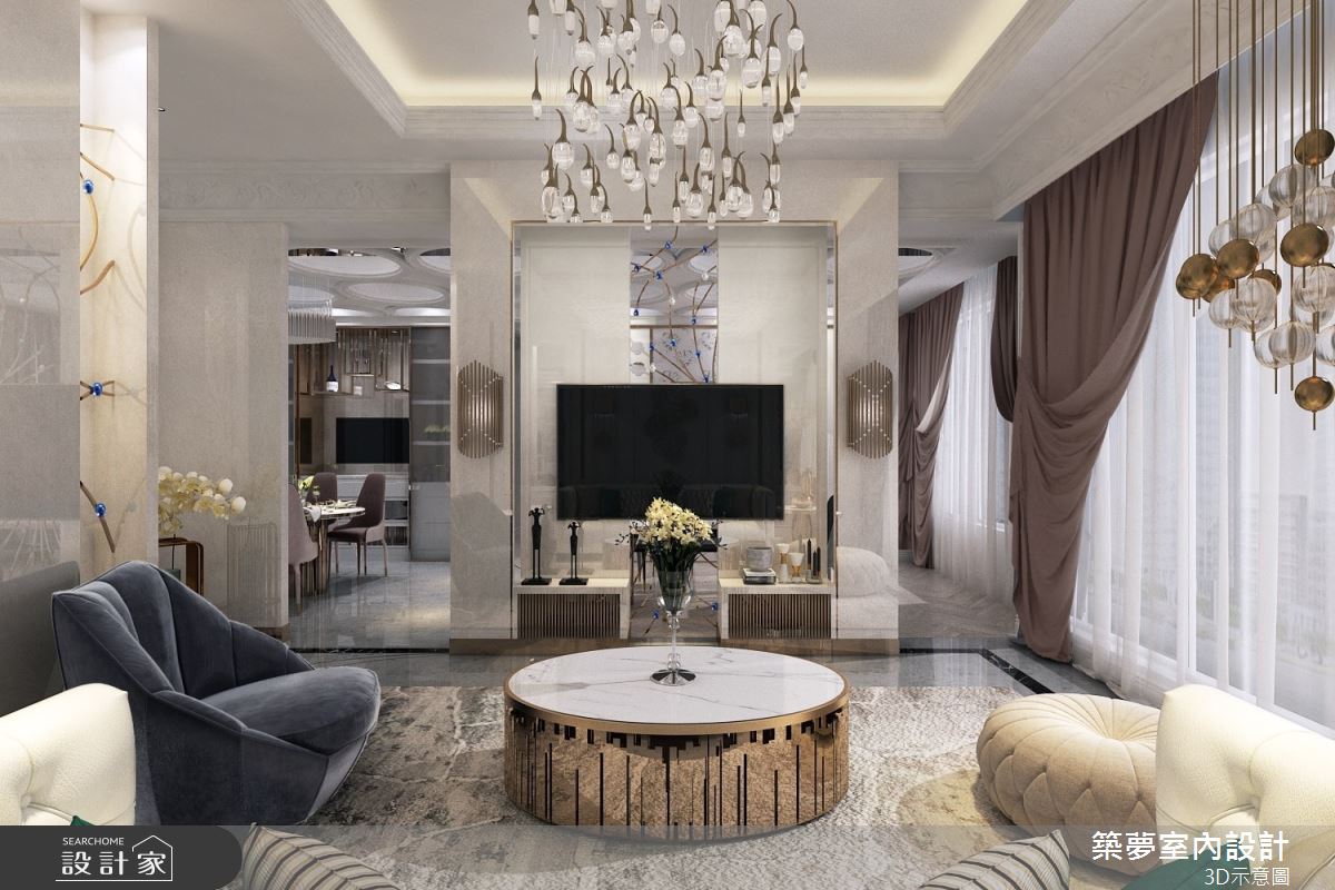 本案為築夢室內設計的100坪新古典新成屋(5年以下)設計作品,格局為單層四房的居住空間。居住成員包含2位大人、2位小孩。全室建材的搭配,應用壁紙、海島型木地板、超耐磨木地板、鍍鈦金屬、大理石、線板、絲絨布、Swarovski水晶,展現溫馨的居家氛圍。