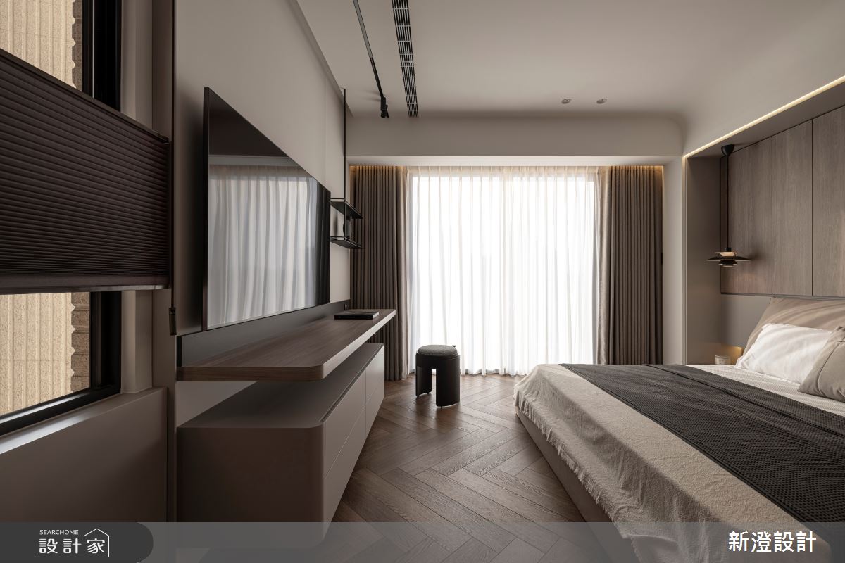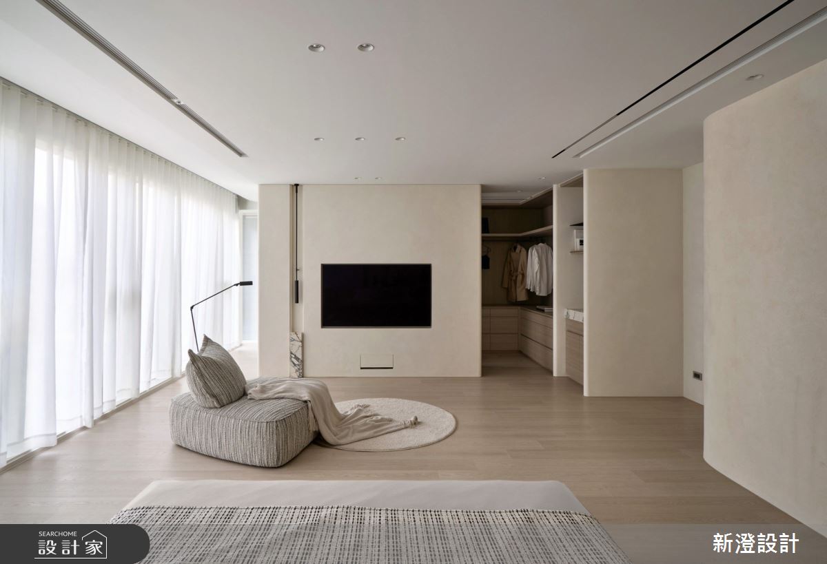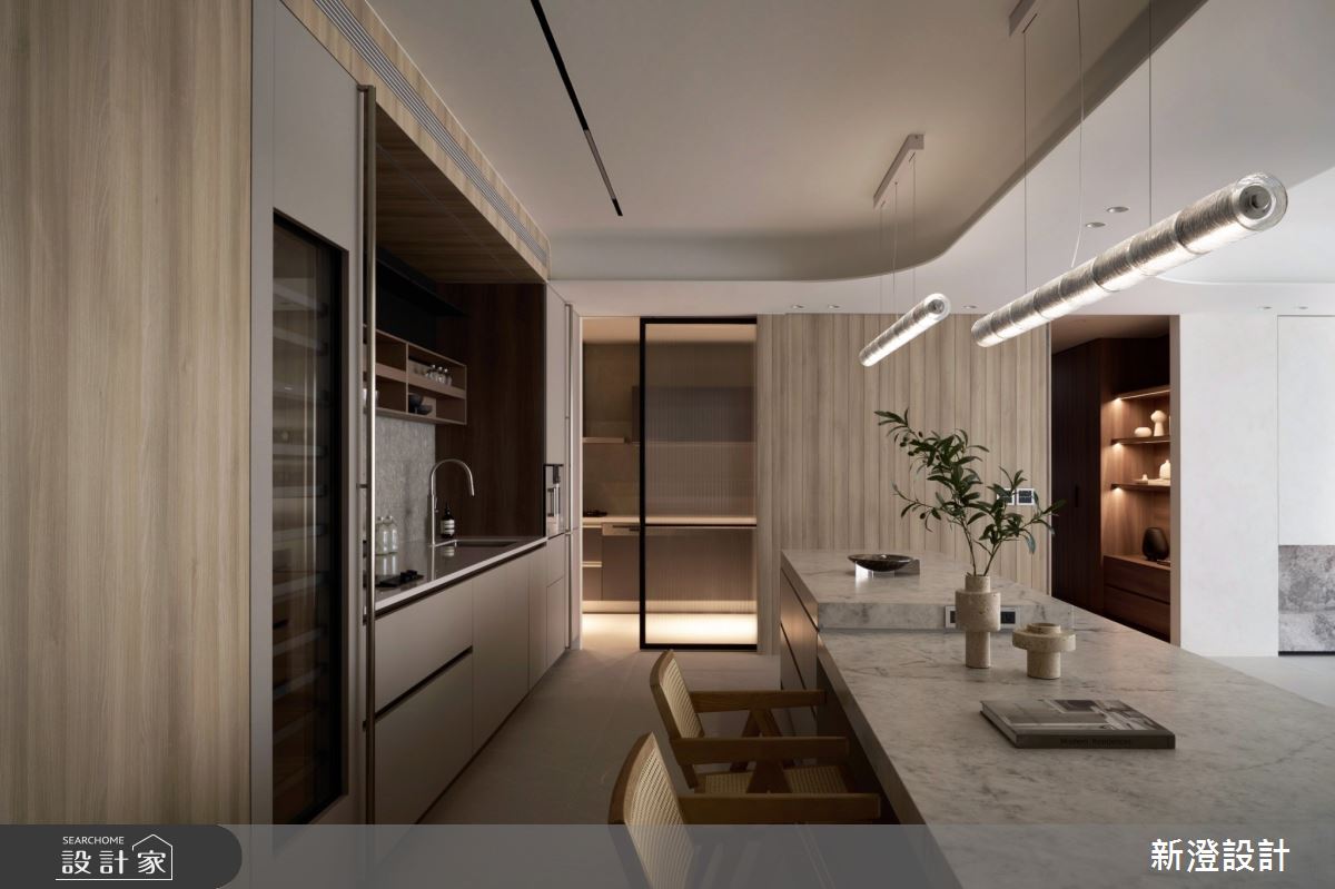 新澄設計以油漆、壁紙、水泥漆、超耐磨木地板、石英磚/拋光石英磚、不鏽鋼、鐵件、灰鏡、烤玻、木作貼皮、系統板材、大理石、磁磚、賽麗石、軌道燈、石材、薄板磁磚、特殊漆的搭配應用,呈現現代風居家氛圍,將此間94坪、三房、單層、毛胚屋打造成舒適愜意的家庭空間,完成3位大人、2位小孩、2位長輩全家人的夢想之居。