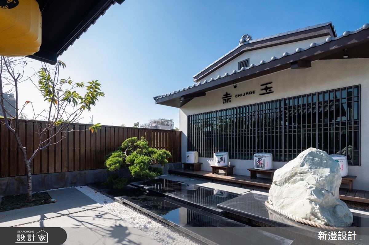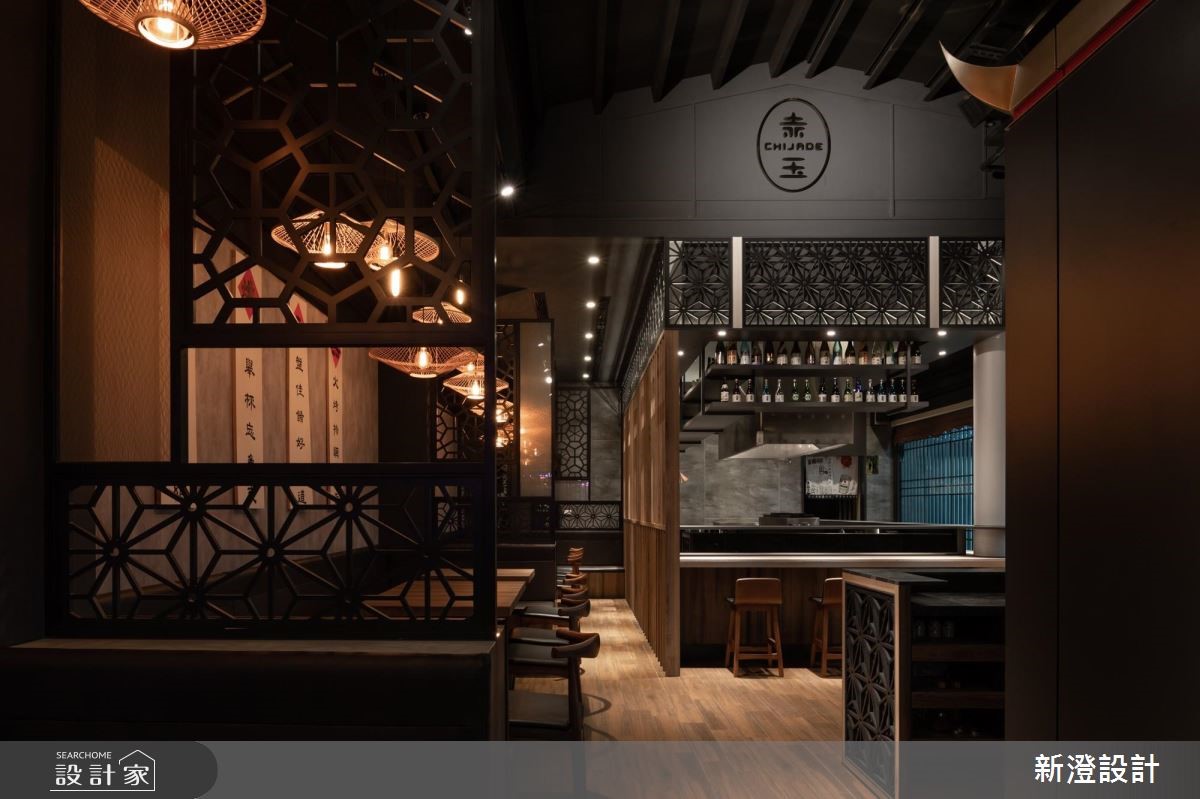灰藍色調的瓦片搭建整體建築的屋頂,帶有傳統神社廟宇的色彩與質感,入口搭配禪風的庭院造景,成為日式餐廳的精髓與生命力,讓人忍不住想一探究竟。 木紋地板鋪陳一室,天花板以簡約、無刻意裝潢的黑色調襯底,成功拉高天際線,讓空間更顯寬敞大器,軌道燈串連其中,與室內部分的風格燈飾相互調和,營造出濃濃的日系和風情境,讓人踏進空間裡隨時感受平和、靜謐之感;吧檯上方以古典味的窗櫺妝點並環繞其中,燈光穿透鏤空孔縫,醞釀一抹幽靜的氣息;空間裡透過木作造型格柵、復古造型的窗櫺界定不同主題的座位區,開放空間裡隨著竹編、飛碟狀的吊燈懸掛其中,擦亮幽暗的視覺,增添一抹日式的雅緻氛圍。 小編的最愛 空間裡運用大量的黑灰色調,拉出漸層線條與立體感,大地色系的木紋肌裡點綴其中,保有日系文化的溫潤與貼近自然,加上局部的細節雕琢與燈光的用心安排,展現風格獨具的日系特色。