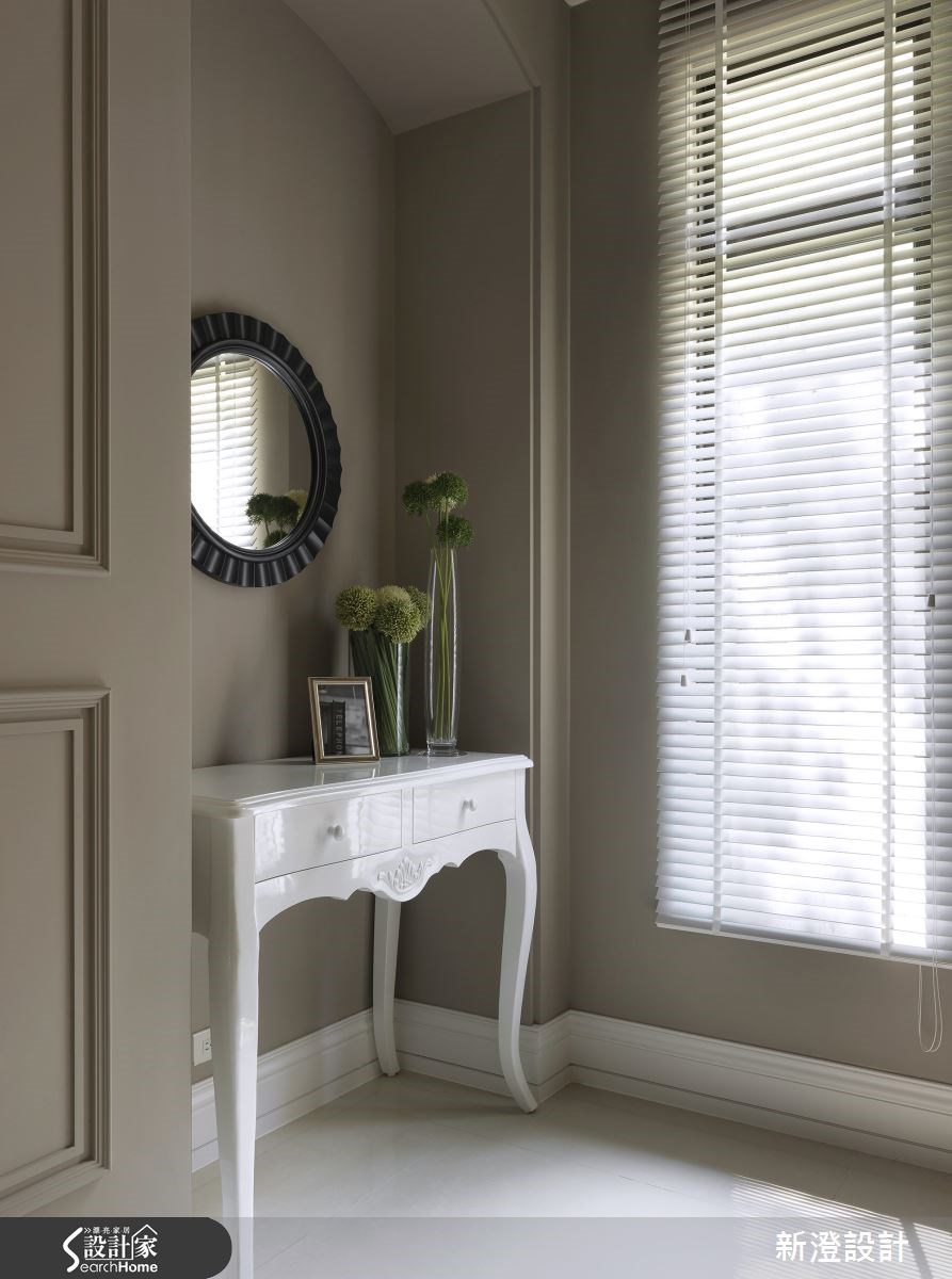 有別於繁複奢華的制式新古典風格,在此 52 坪住宅內,設計師採以簡約色彩鋪述全室,並於天花板、壁板做出不過份複雜的堆疊線條,彰顯饒富變化的低調層次,將古典精神自然地融入現代居家之中,快跟著小編一起來看看吧! 入門處,設計師運用畸零區塊,配置玄關桌、牆面掛鏡妝點空間,打造精緻小巧的端景畫面;客廳則採用雙主牆設計,讓沙發背牆挹注展示機能,電視牆則給予仿壁爐設計,各自建構唯美的視覺意境,並讓兩面牆以線板框飾作為呼應語彙,彰顯新古典格調,搭配大地色沙發、單椅,與奶油色空間基調交互融合,調配出簡潔不失穩重的氛圍,而軟件的多角度陳列,亦形成相聚對話的溫馨場域;餐廳則以圓桌帶出圓滿氣質,並享有雙向採光,構成明亮溫馨的用餐氣氛,且讓餐廚呈開放規劃,給予拉長延伸的空間景深;臥房床頭則採以藕色壁布鋪貼,以細膩直紋增添牆面豐富表情,且透過地毯、大床與窗簾的輔助,營造溫暖柔和的睡寢氛圍! 小編的最愛 衛浴給予清淺紓壓的空間配色,並配置木百葉簾,注入自然舒適的視覺風格!