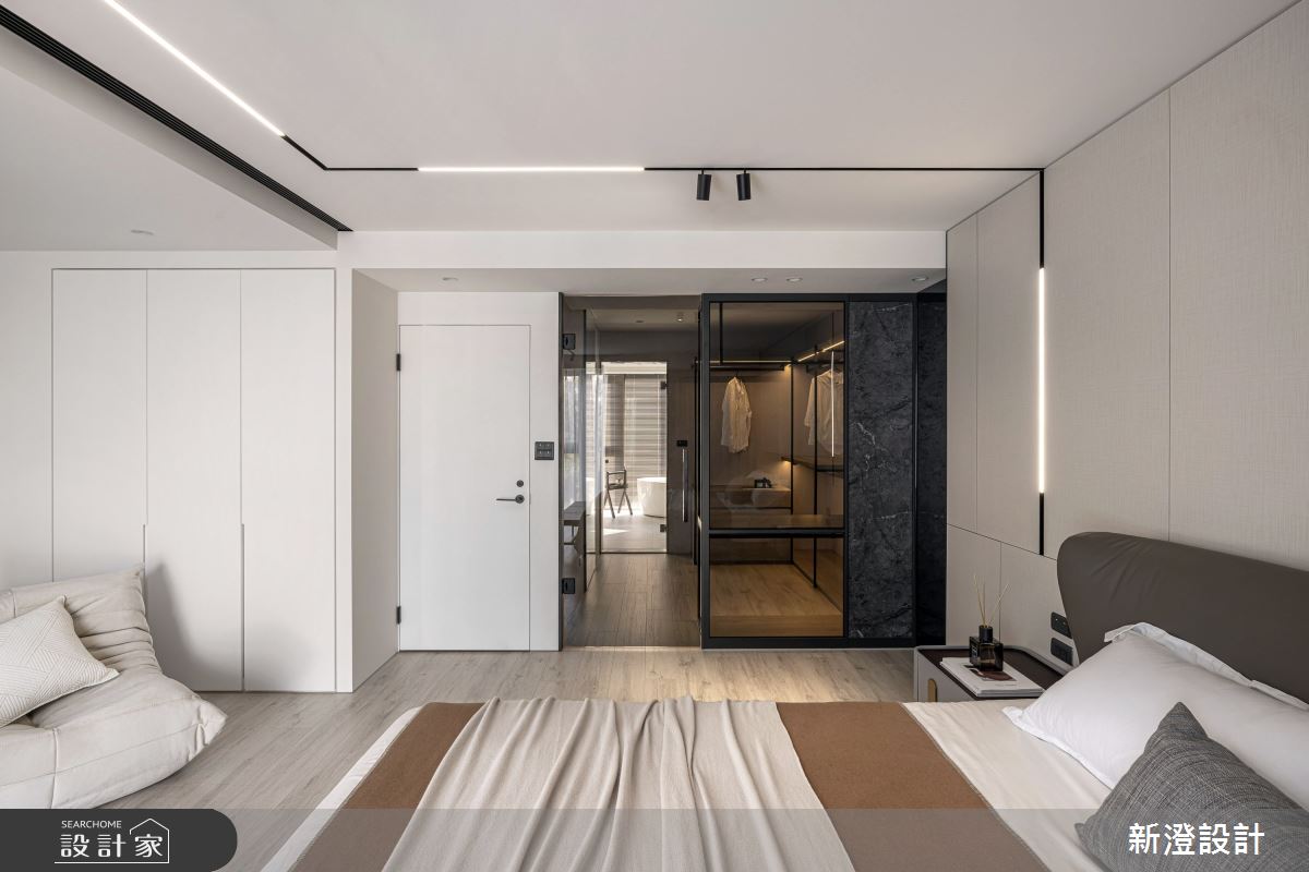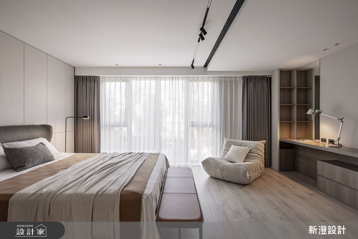 新澄設計以油漆、壁紙、水泥漆、超耐磨木地板、石英磚/拋光石英磚、不鏽鋼、鐵件、灰鏡、烤玻、木作貼皮、系統板材、大理石、磁磚、賽麗石、軌道燈、石材、薄板磁磚、特殊漆的搭配應用,呈現現代風居家氛圍,將此間94坪、三房、單層、毛胚屋打造成舒適愜意的家庭空間,完成3位大人、2位小孩、2位長輩全家人的夢想之居。