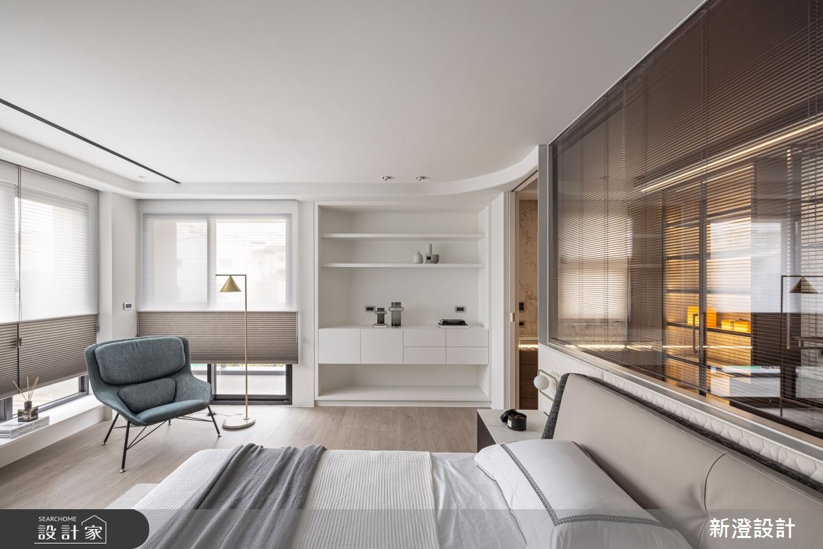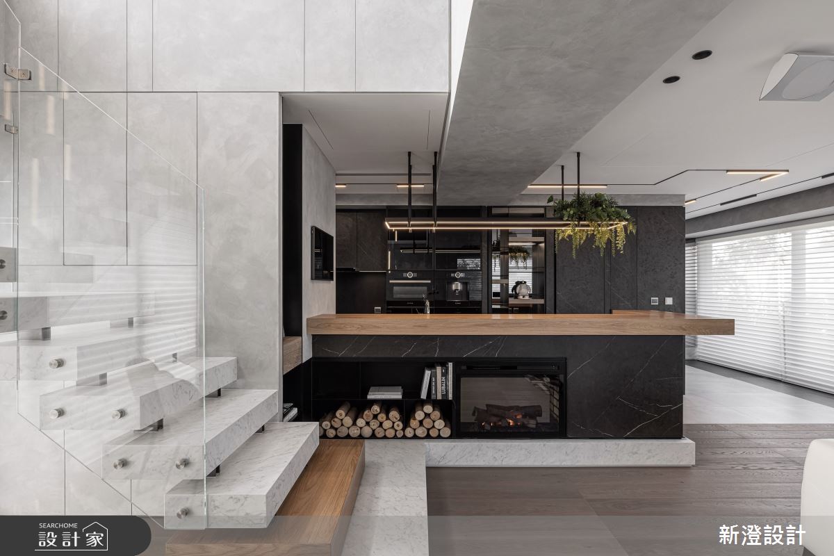 新澄設計以海島型木地板、鍍鈦金屬、玻璃、陶瓷板的搭配應用,呈現現代風居家氛圍,將此間60坪、三房、樓中樓、新成屋(5年以下)打造成舒適愜意的家庭空間,完成全家人的夢想之居。