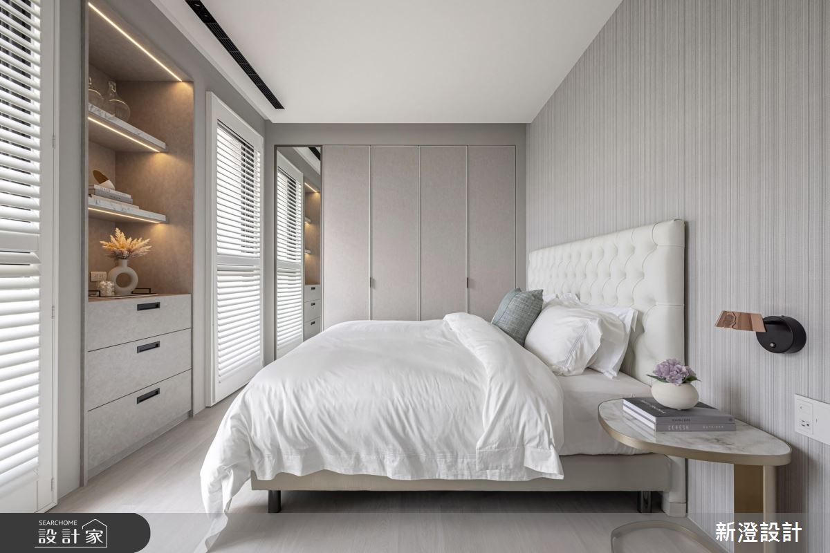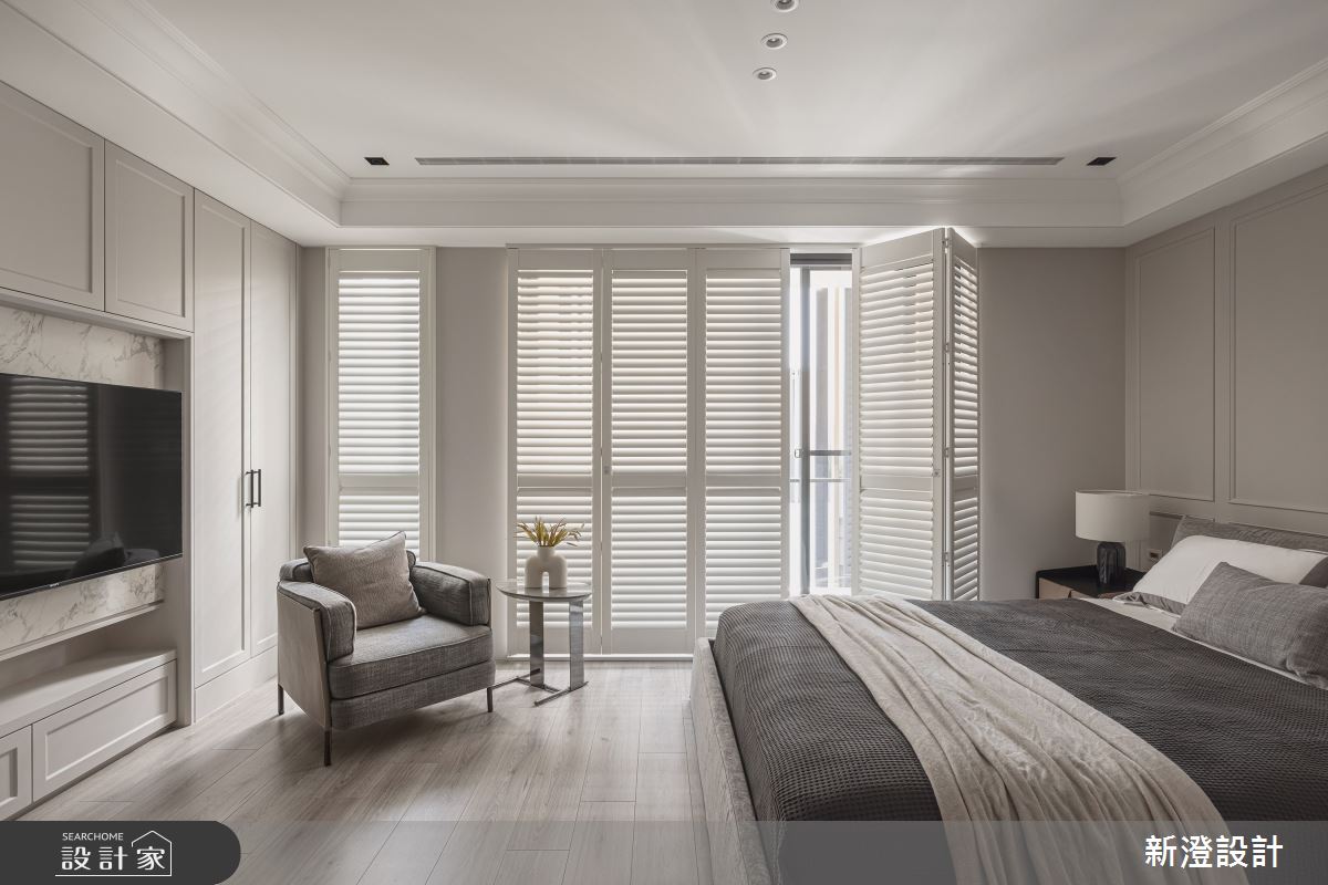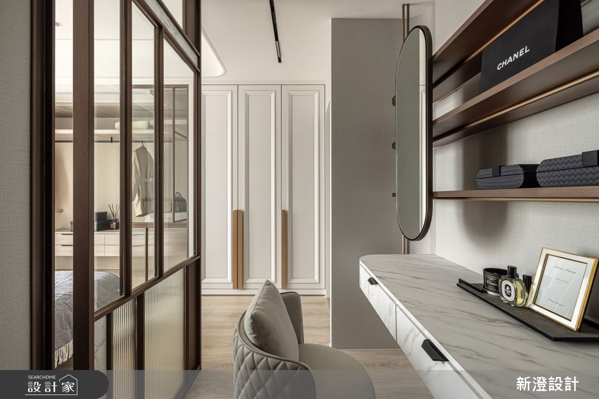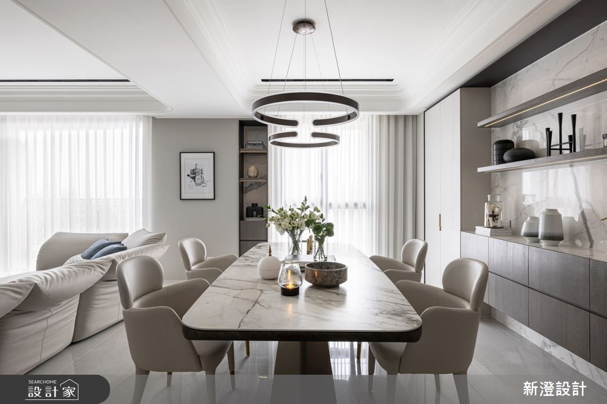 新澄設計以鐵件、大理石、鍍鈦、烤漆木作、木皮的搭配應用,呈現新古典居家氛圍,將此間60坪、四房、透天別墅、新成屋(5年以下)打造成舒適愜意的家庭空間,完成2位大人、2位小孩、1位長輩全家人的夢想之居。