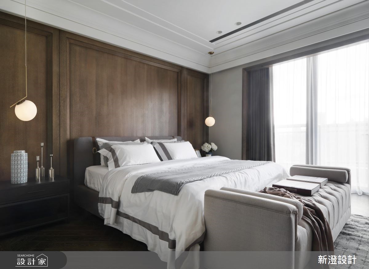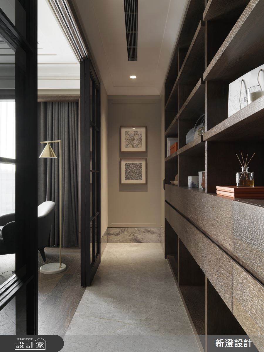 屋主一家人從屋案 72 坪毛胚屋時期就與新澄設計合作,期許設計師能將的採光優良、通風佳的基地優勢,發展大器卻不顯過度奢華的現代風宅邸。 設計師巧妙以精選家具,劃分全開放空間中的場域,除了創造回自動線,同時也保留了公領域之中複合式機能、串連書房與客廳並大幅提高互動性。針對大宅質感營造,設計師注入新古典元素,應用人字拼法順應軸線鋪設實木地板,並在天花採用細密的線板框出雅緻層次,佐以造型特殊的懸吊水晶燈飾拉伸天花高度感受。電視牆則應用對襯概念,結合大理石與木皮線板,打造沉穩低奢的感受。針對收納機能,為了不影響開闊動線,皆沿四面牆收攏,創造大面積收納量度。餐廚空間利用吧台串連廚房與餐桌,更延續客廳風格,以石材與木皮打造大器氛圍。 小編的最愛 大地色系為基調的主臥,比照歐美規格,結合起居、閱讀功能,成熟的木皮床頭牆佐石紋踢腳板,完成了屋主對現代風大宅專屬質感的期待。