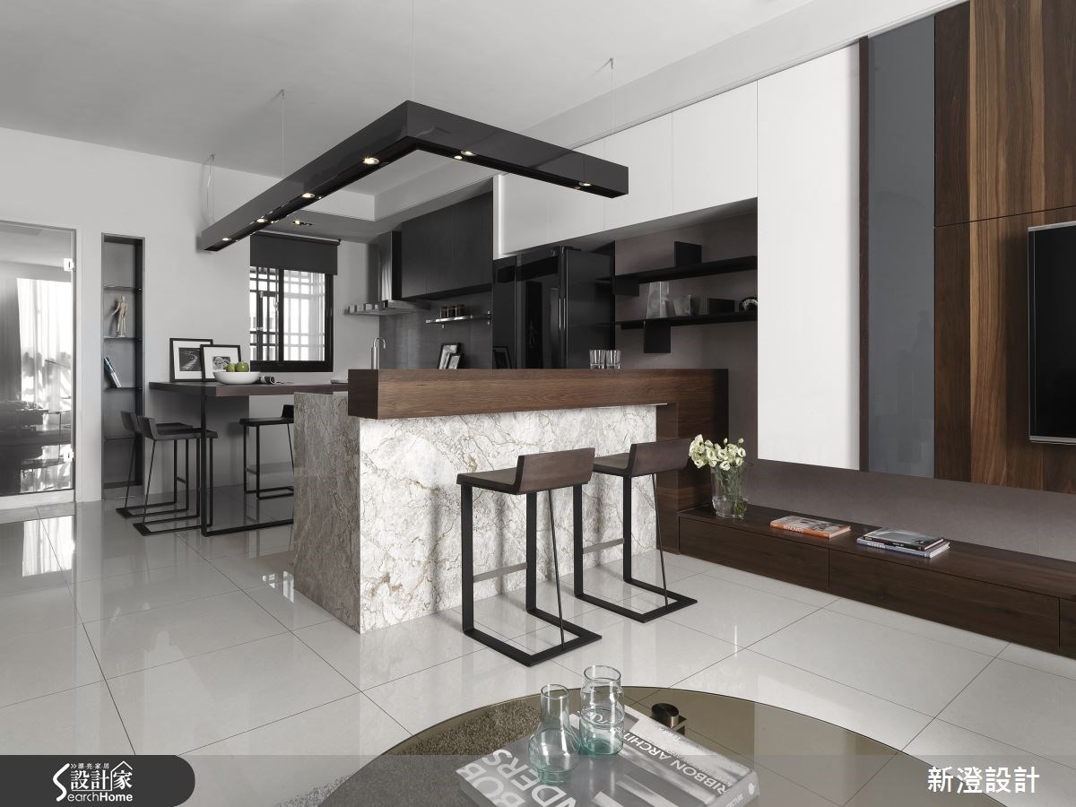 設計師為一家三口的 50 坪的預售屋,利用石材紋理與鏡面反射效果,打造深淺交織的優雅飯店風格形象,達成大量複合材質與色調的完美運用。 寬敞的全開放空間包含了客廳與餐廳,溫潤的深色木皮包覆了電視牆,灰質鋼琴烤漆成為客餐廳的連接點,電視牆下方的木作置物檯巧妙向上翻轉延伸,成為石材吧台的邊緣修飾,搭配高腳椅即是連接兩方場域的最佳佈置。一字型廚房與用餐區域上方懸吊的 L 型照明系統成為視覺亮點,成為該場域的框設。廚房系統櫃體的木質面板富有成熟質感;木質層板嵌入壁面搭配鐵件桌腳,成為別具特色的餐桌,與系統櫃相互呼應,形成和諧景象。主臥人造大理石除了電視牆功能,更成為後方開放式閱覽空間的屏隔,全室以灰白色調進行搭配,達成絕妙的質感平衡,大面積全身鏡製造了通透雙倍視覺;偌大的衛浴空間乾濕分離,雙鏡面與水龍頭讓盥洗成為舒適悠閒的進程,石材牆面與清淺格櫃的優雅組合有著飯店般的高端規格。 小編的最愛 臥房結合書房功能,後方的大面積書櫃盡顯知性人文感,石牆給予閱覽空間隱密性,卻不顯封閉,與臥房完美融為一體。