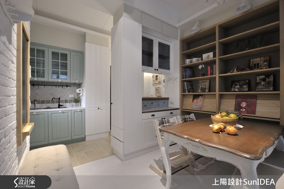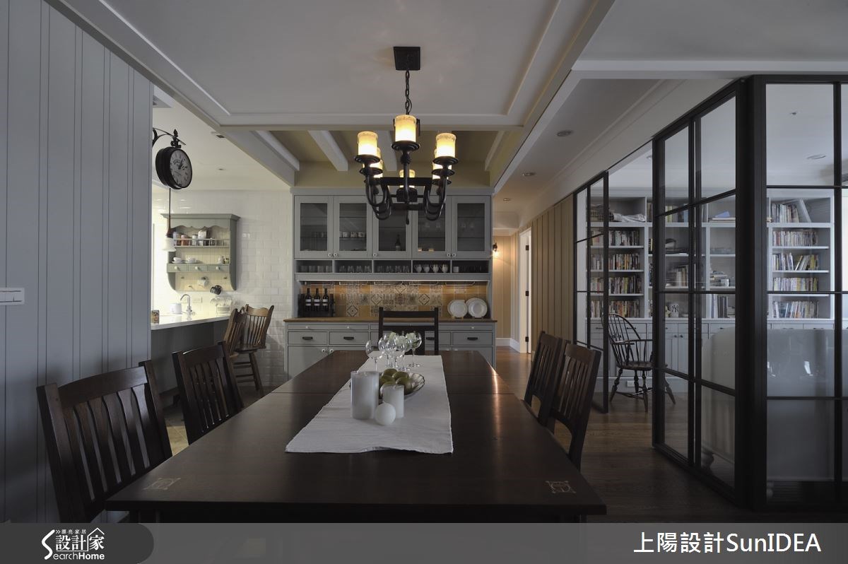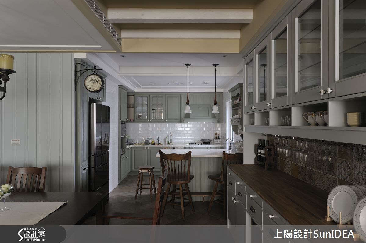 屋主從預售屋階段開始就與上陽設計合作,設計師利用軟件佈置與橡木地板色澤,為公領域營造成熟穩重的美式風格,與純白線板及格櫃形成亮暗間的鮮明對比。 為了進一步提純美式氣息,電視牆設計為架高壁爐樣式,同時增加下方空間收納巧思。沙發背牆利用櫃體、輕隔間與格狀玻璃等三種富有層次的元素,成為客廳與後方書房的空間劃分,通透不顯沉重,同時漆上鵝黃色調化身照片牆,成為眾所矚目的焦點。用餐空間地處各空間往來樞紐,包含典雅的外玄關、沉穩的客廳、廊道及透亮的書房,天花上方對襯設置純白木樑,餐櫃壁面鋪設花磚,與漆上嫩芽綠的一字型開放式廚房,為整體空間注入淡雅優美的古典鄉村氣息;主臥以純白文化磚作為壁飾,佐以灰藍壁板及芥末黃跳色牆面,增添豐富的視覺溫潤感。 小編的最愛 為了讓位於房屋中段的餐廚空間接收來自半開放書房的明亮陽光,特意以格狀玻璃引光入室,佐以油漆與花磚的色彩搭配,成功消弭沉悶感。