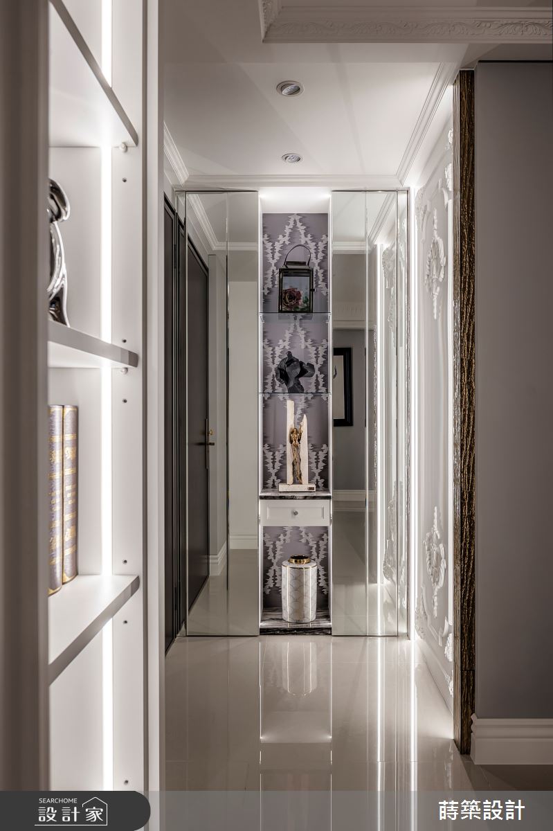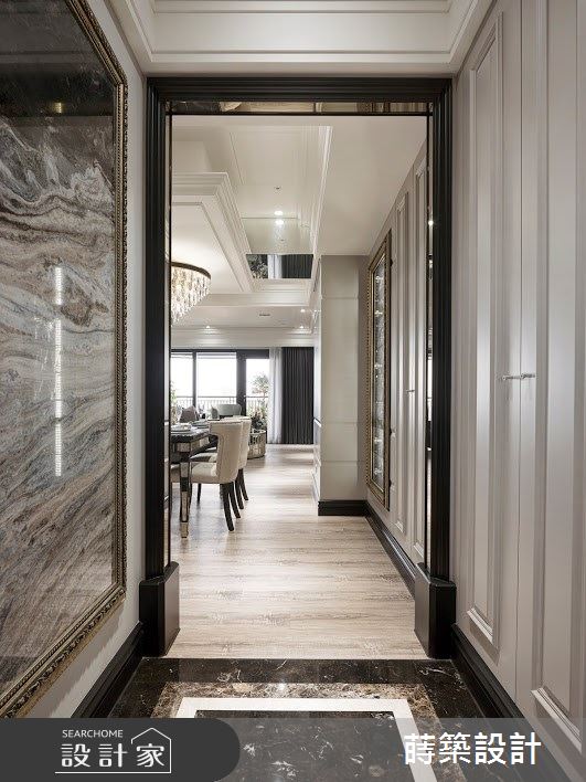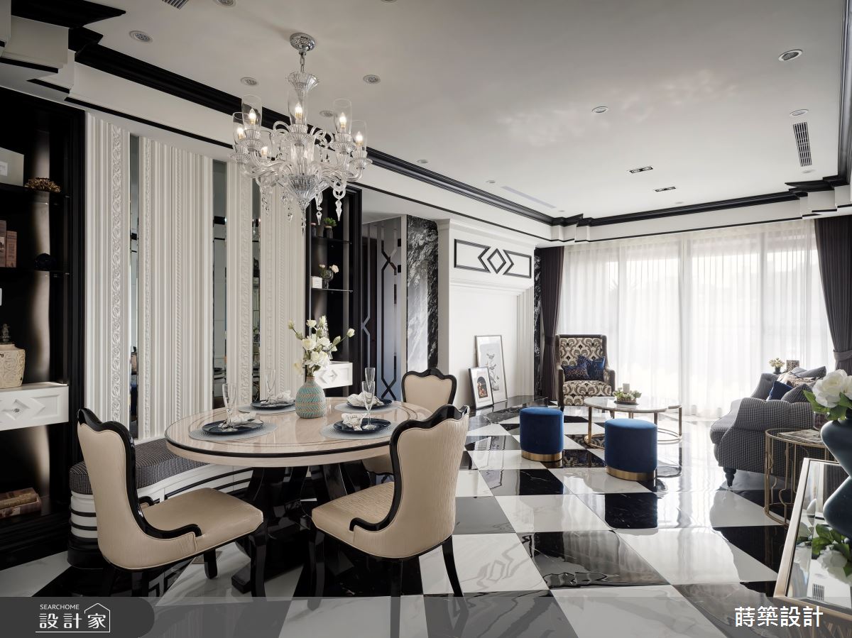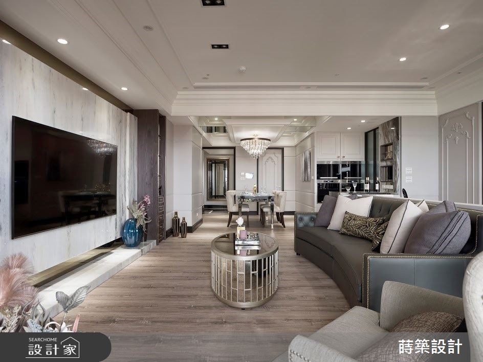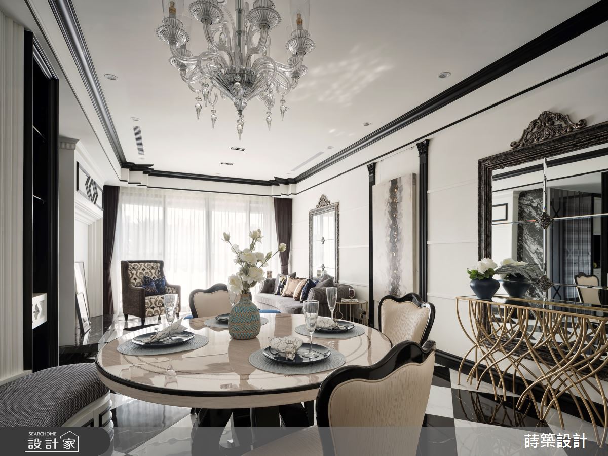 由蒔築設計精心規劃的45坪三房住宅空間。因應屋主需求,設計師運用新古典作為主軸,搭配壁紙、大理石、線板、鏡面、金屬,打造全家人的夢想家居。