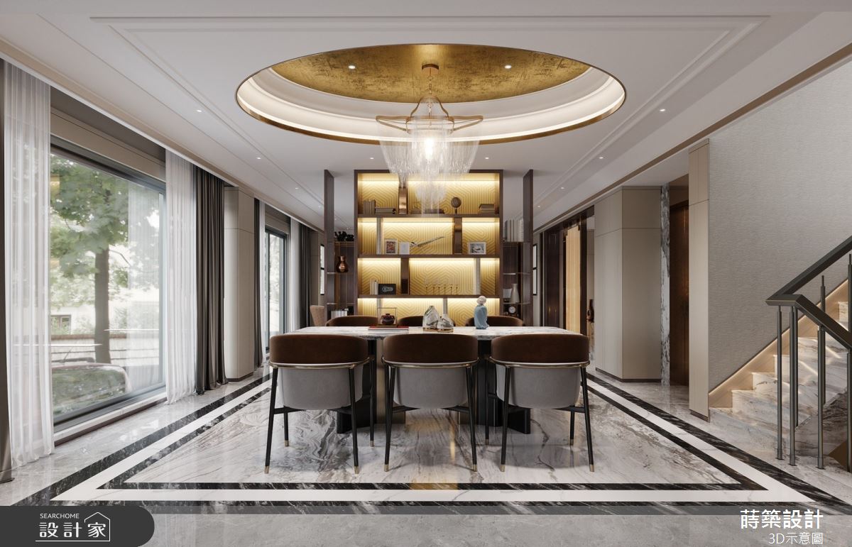 來自蒔築設計的150坪新古典住宅案,是一間透天別墅新成屋(5年以下)的五房格局,設計師藉由建材以花磚、壁紙、超耐磨木地板、大理石、線板、鍍鈦、玻璃的搭配應用,實現一家人的理想生活。